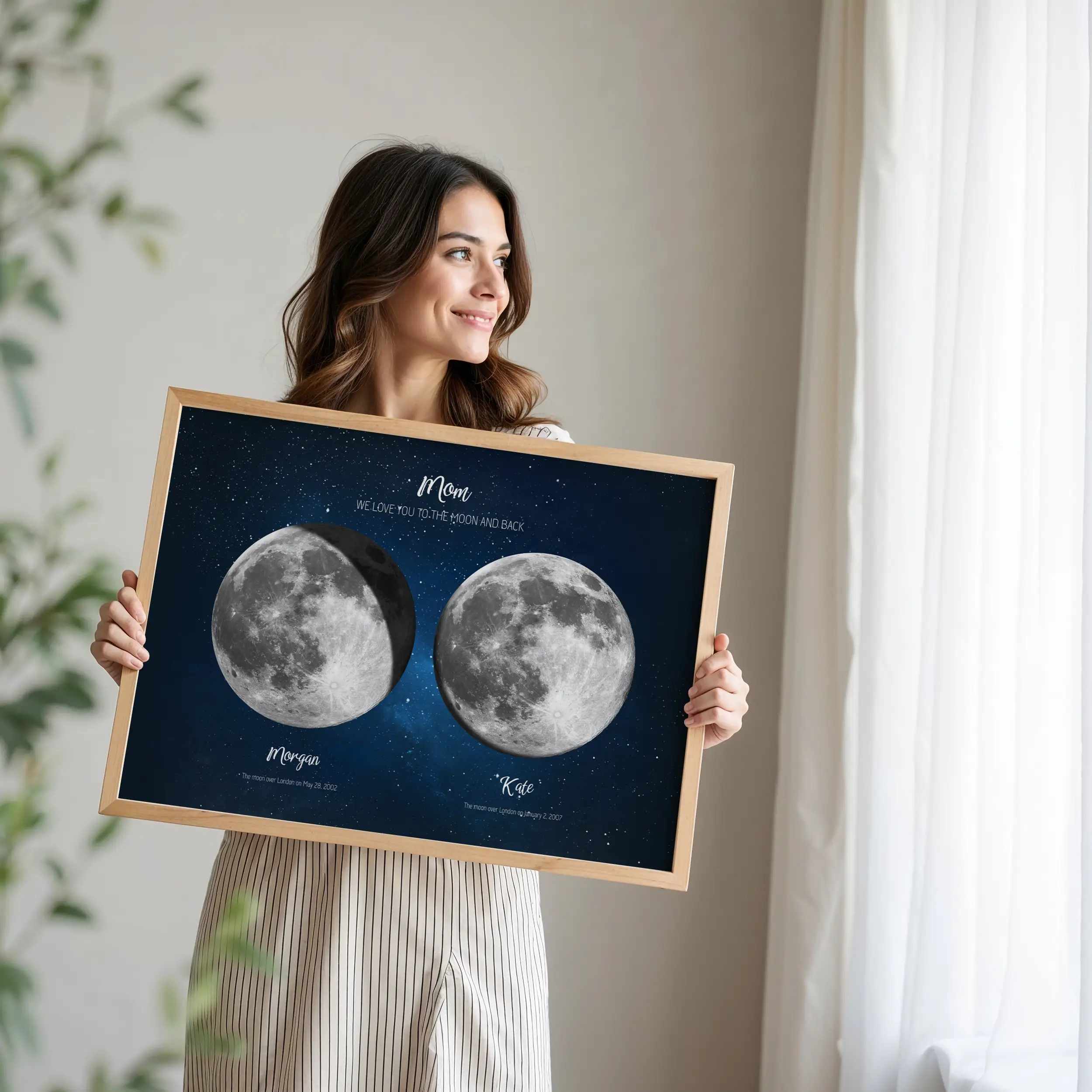 Looking for a special gift for Mom? Two Moons for Mom is a heartfelt and unique gift that will make her smile. This personalized print or canvas showcases the moon phases from two significant dates, such as the birth dates of her children. It's a beautiful way to capture these precious moments and remind her of the special bond she shares with her kids.