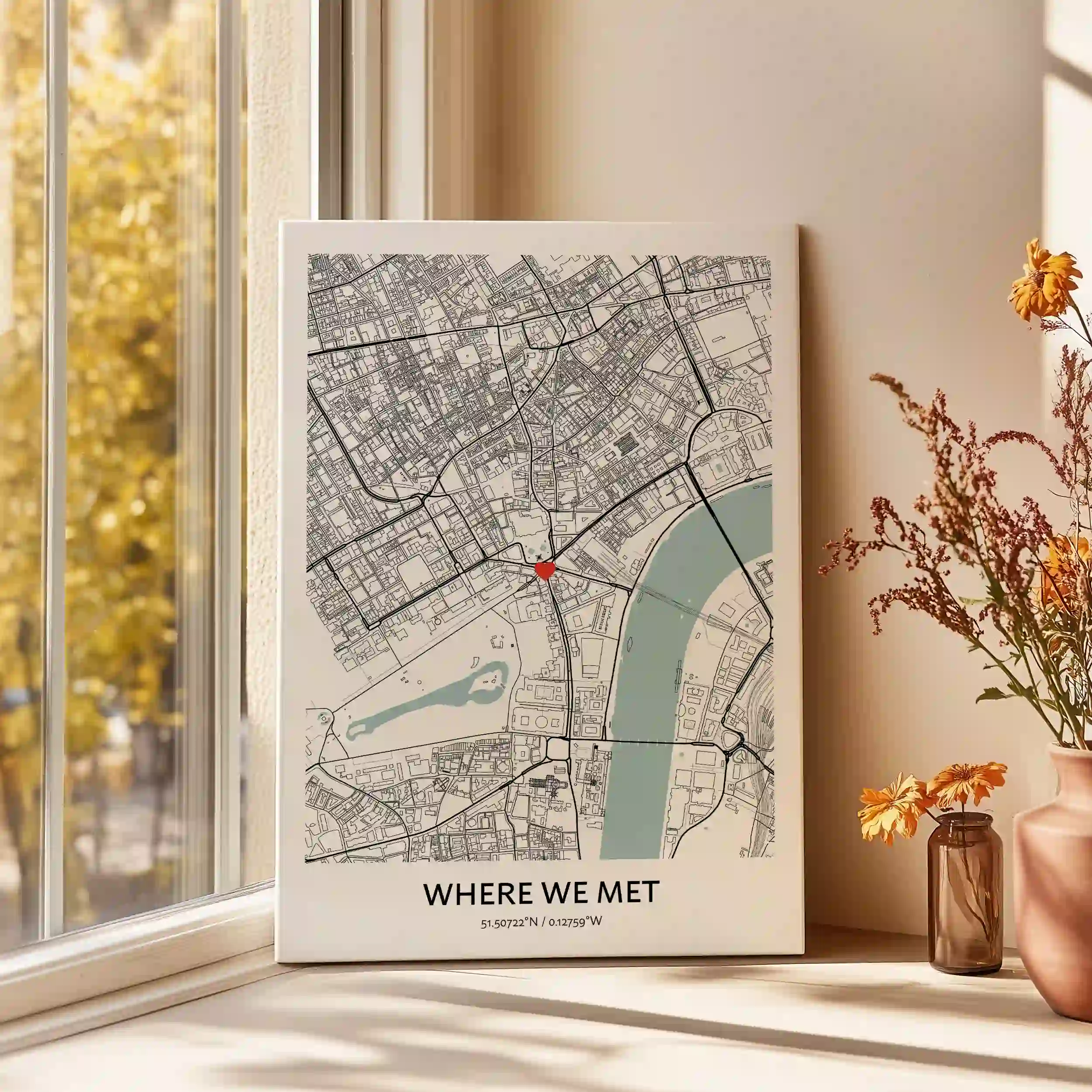 Looking for a unique and heartfelt gift? Our Where We Met Map Canvas is the perfect choice. Highlight the special place where you and your loved one first met with a beautiful, personalized map.