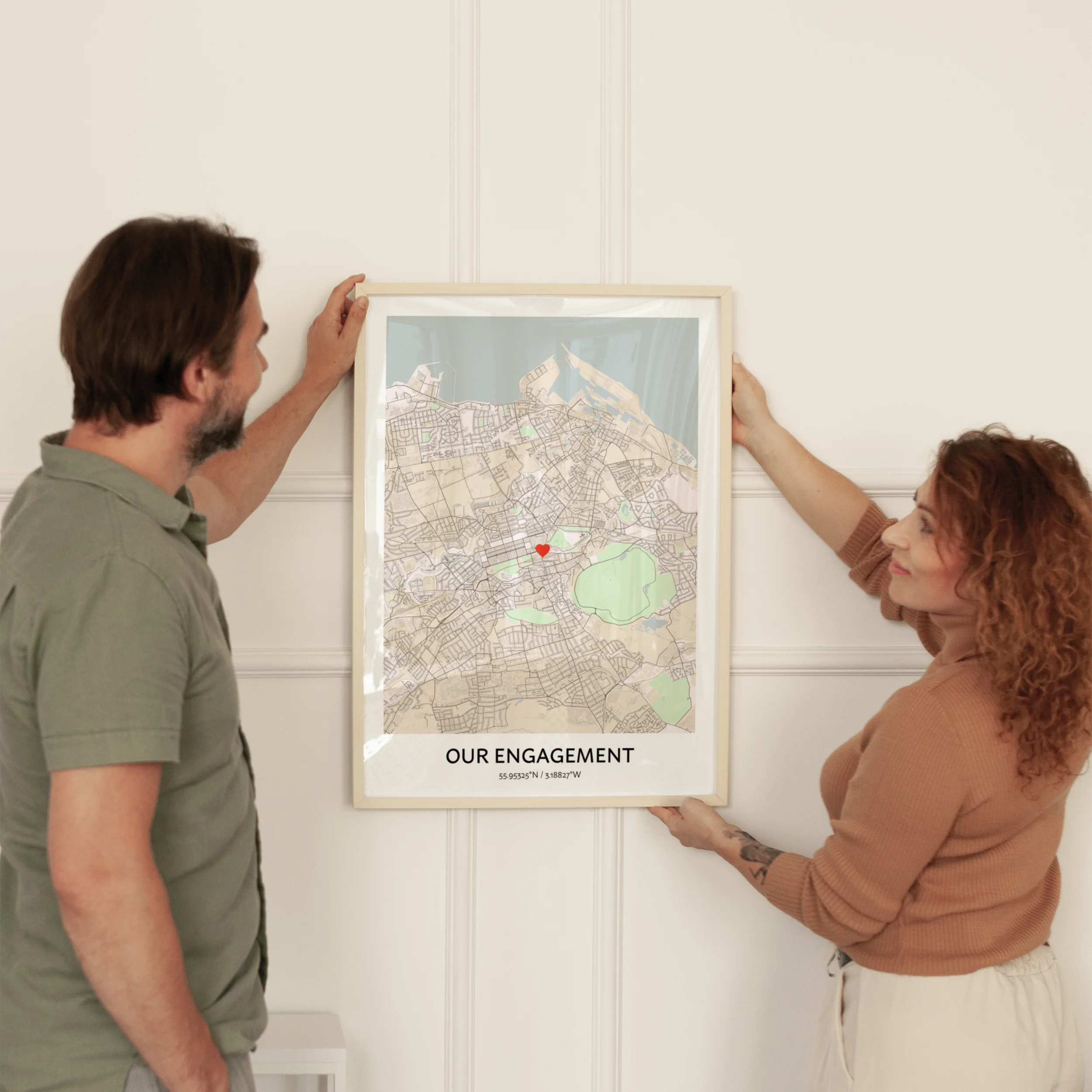 An Engagement Map is more than just a map; it's a poignant tribute to the exact location where your love story took a new and enduring direction. It's a beautifully personalised map print that encapsulates a chapter of your unique love story, a chapter which you'll take pride in sharing with anyone who steps into your home.