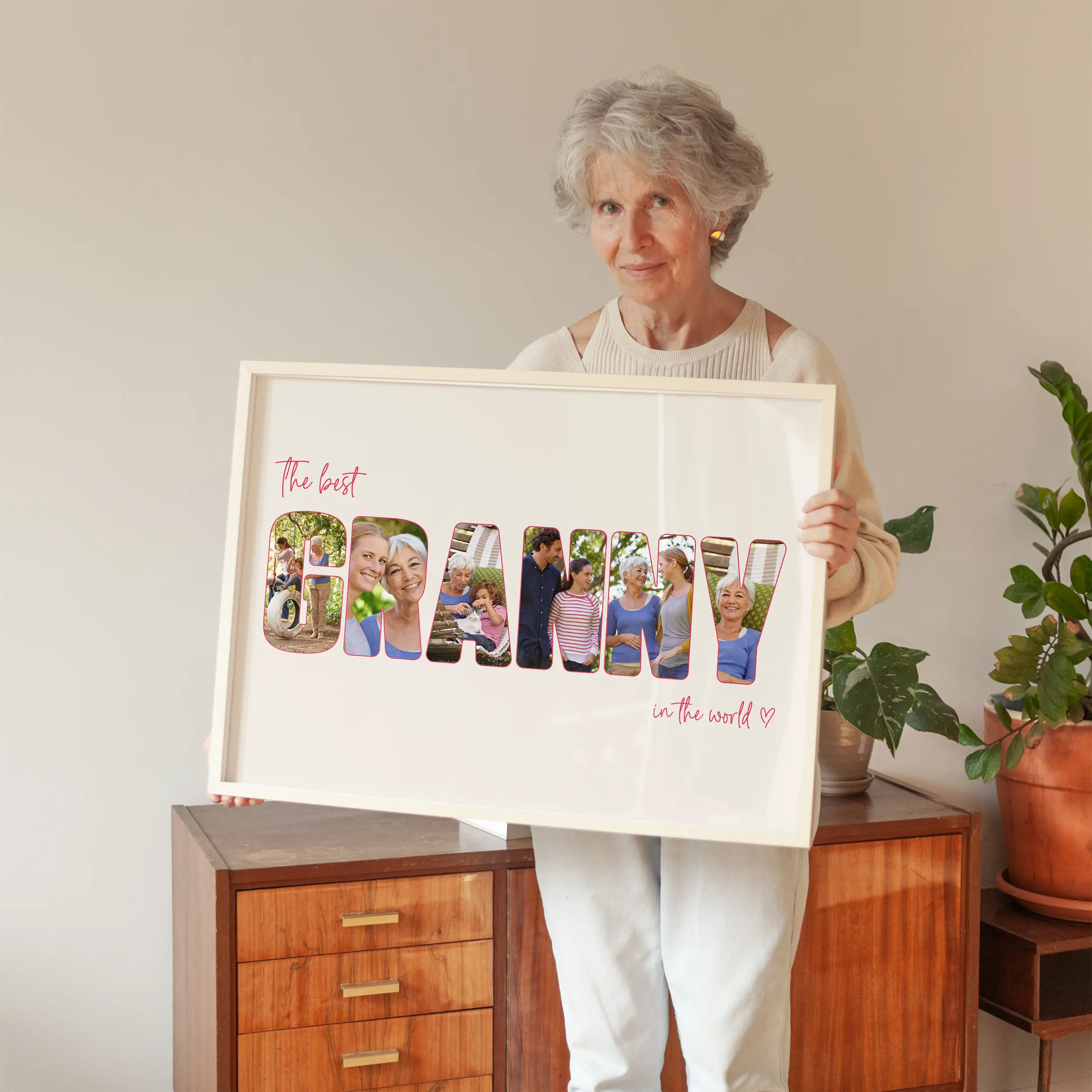 To create your own Grandma Letter Photo Collage, simply head to our online editor and upload your favourite photos. Each letter of the chosen word will be made out of your chosen photos, creating a unique, personalised, and heartfelt gift. You can choose from different print formats, including posters, canvas or framed prints, or digital download files for self-print.