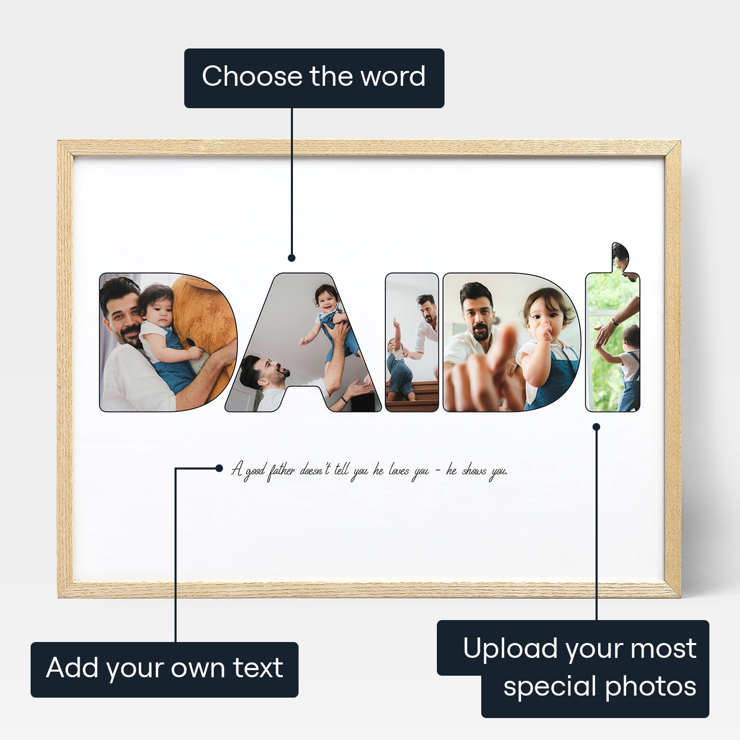 To create your own Dad Letter Photo Collage, just head to our online editor and upload your favourite photos. Each letter of the chosen word will be made out of your chosen photos, creating a one-of-a-kind piece of art. You can choose from different print formats, including posters, canvas or framed prints, or digital download files for self-print.