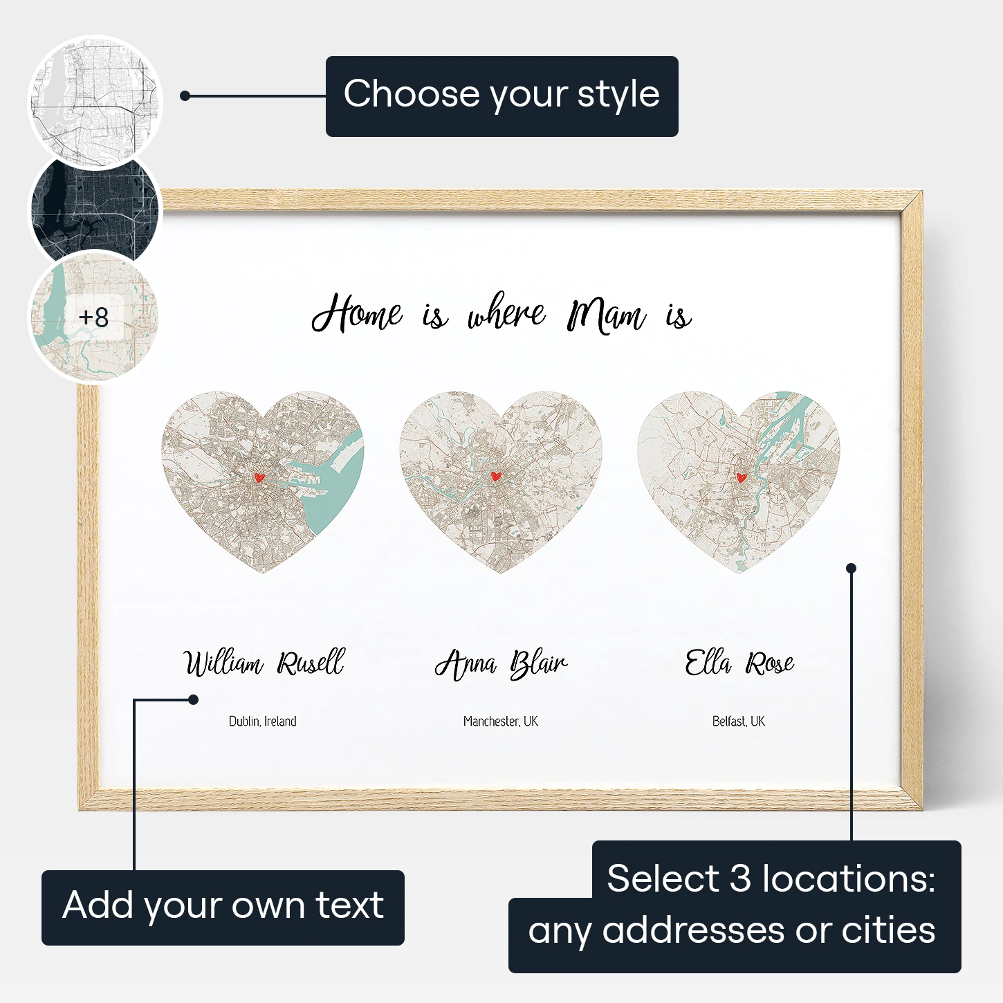 Home is where your mum is, and this beautiful custom Long Distance Mum Map helps you keep her close to your heart. This triple map format lets you customise three small maps within the same print — and the possibilities are endless!