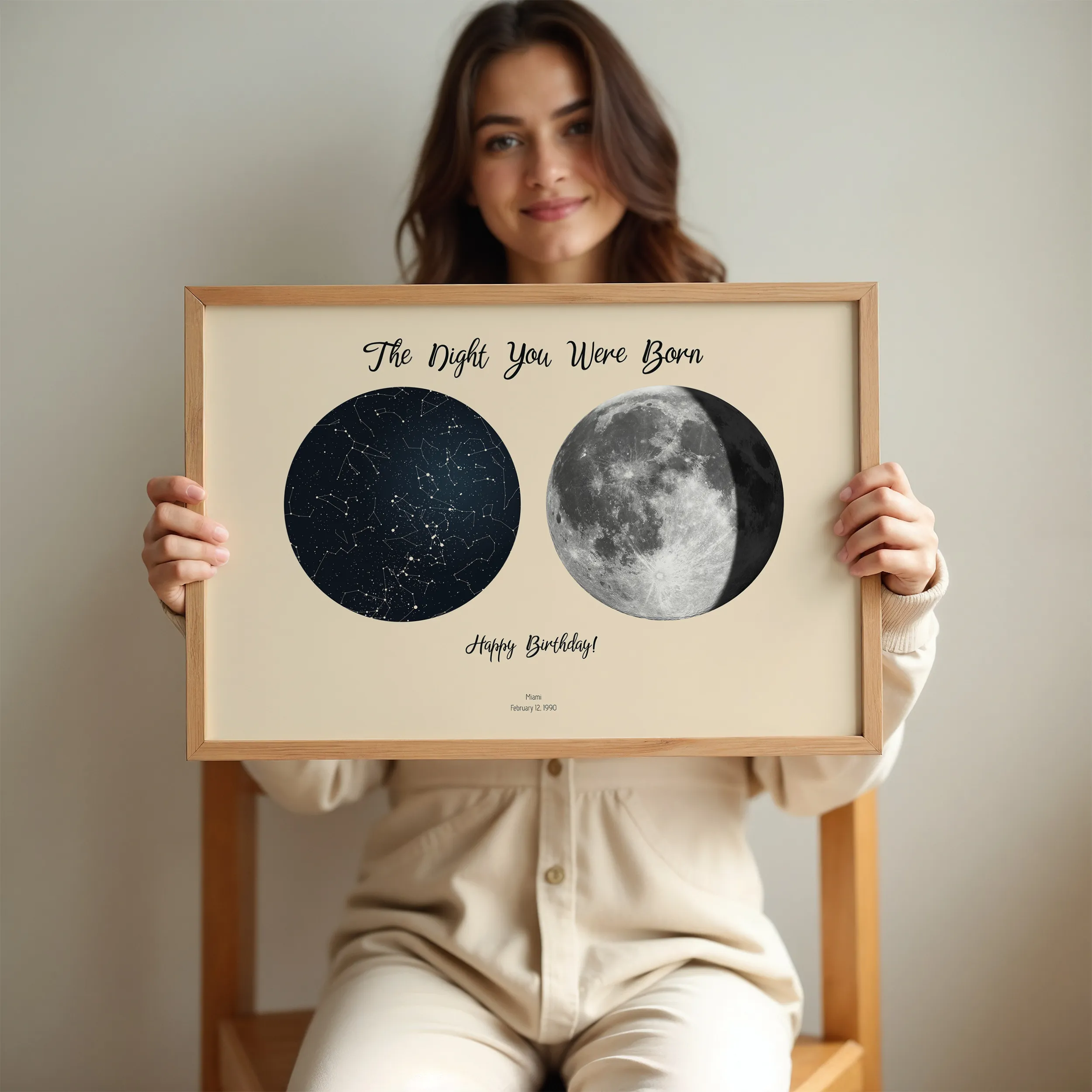 A personalised print capturing the exact moon phase and starry sky from the night you were born