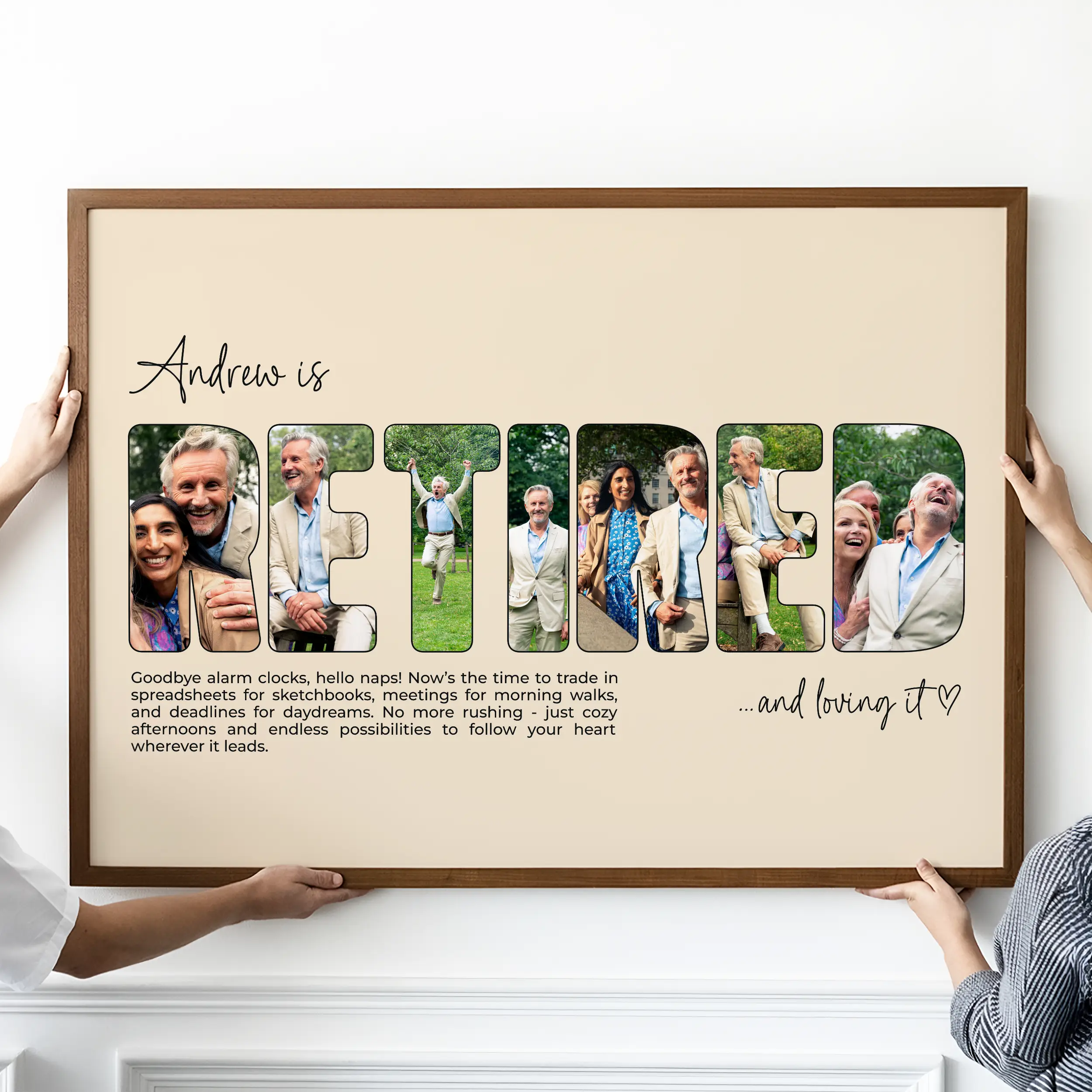 The Retired Letter Photo Collage is a special gift. It's not like the usual presents. It's a collection of memories shaped like the word "retired" or your chosen message. Our online editor is easy to use. You can pick colours for each letter, add text, and place pictures that tell the retiree's story. You control how close or far the photos are and where they go. This makes a beautiful and touching gift. This custom collage isn't just any retirement gift. It's a way to say thank you for years of dedication. Whether it's for a coworker, a team member, or a workplace legend, it captures their journey and the bonds made along the way. It's a special way to show gratitude, remember good times, and honor their legacy. With great care and attention, we turn memories into a real symbol of thanks and friendship. It's the perfect choice for marking a retirement milestone.Retired Letter Photo Collage: Emotionally Meaningful