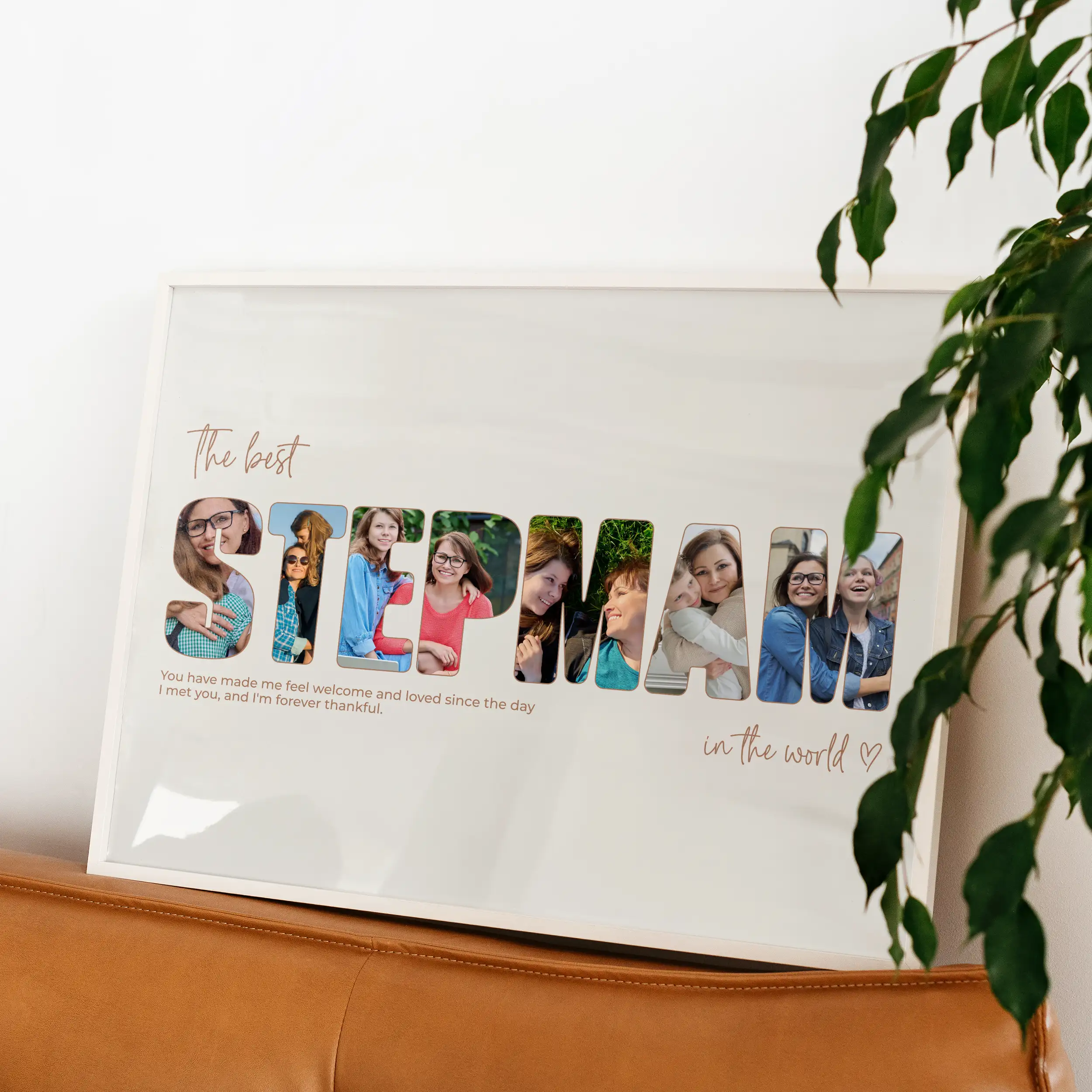 Crafted with care and precision, our Stepmother Letter Photo Collage is a personalised work of art. The process is simple yet deeply meaningful. In our online editor, choose a word that holds significance – "stepmam," "mam," or any word that resonates with your unique bond. Each letter of this word will be filled with your cherished photos, making it a visual tribute to your connection. Customisation is key, allowing you to add upper and bottom text, a personal message that adds a unique touch. You can even select different outline colours for each letter to match your aesthetic preferences. Upload photos for each letter and adjust their position to your liking. Zoom in or out for the perfect fit, ensuring your collage reflects your love and emotions. Choose the format that suits your gifting style. You can order your artwork as a framed keepsake, a printed poster to hang with pride, a canvas to make a statement, or an instant download digital file for a quick and meaningful surprise.