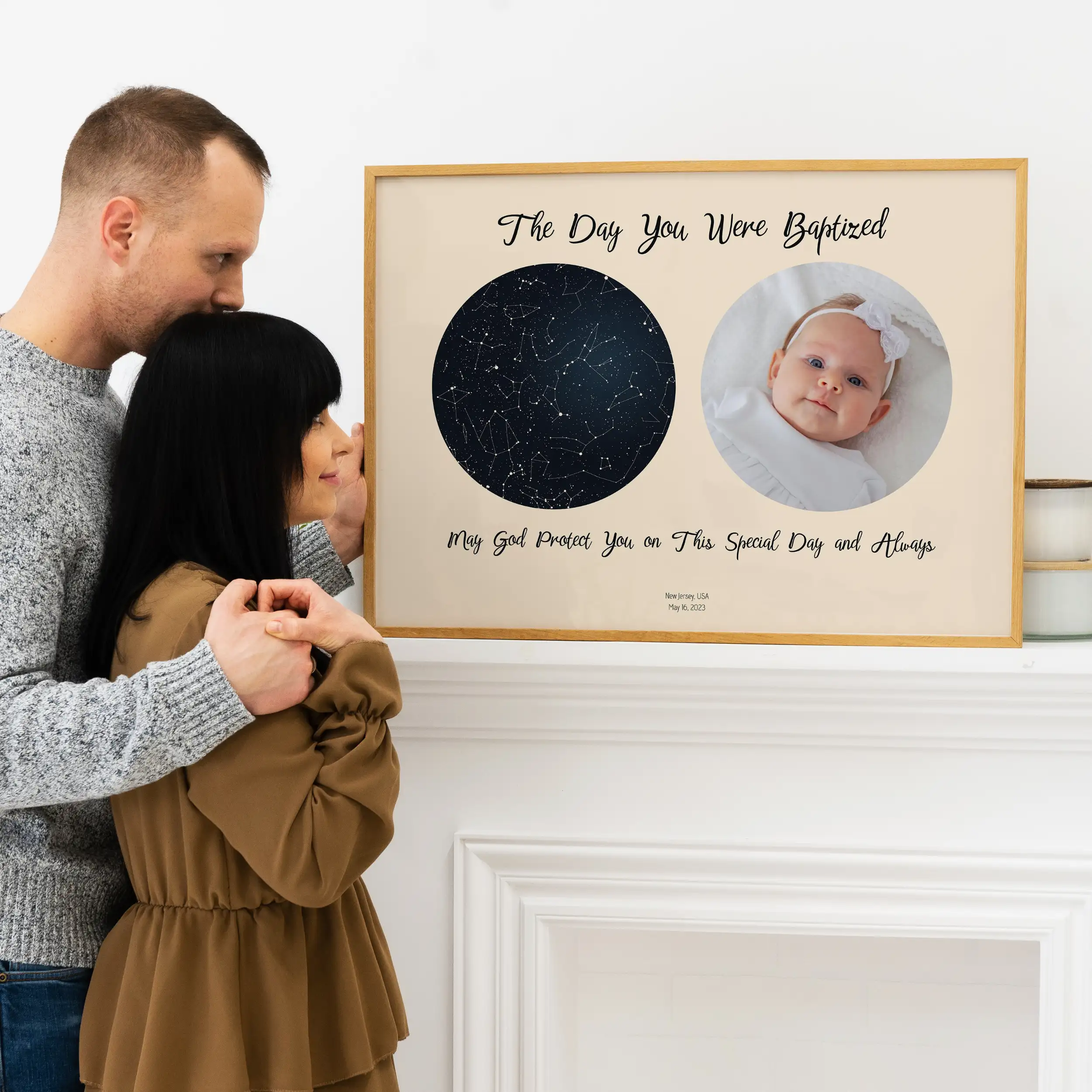 "The Day You Were Baptised with Photo" is a timeless tribute to the sacred moment, offering both the child and their parents a precious memory. Every glance at this star map and photo combination transports them back to that sacred day, evoking a sense of spirituality and love. Make your baptism gift unforgettable with this personalised masterpiece, preserving the memory of a child's baptism in a truly special way.