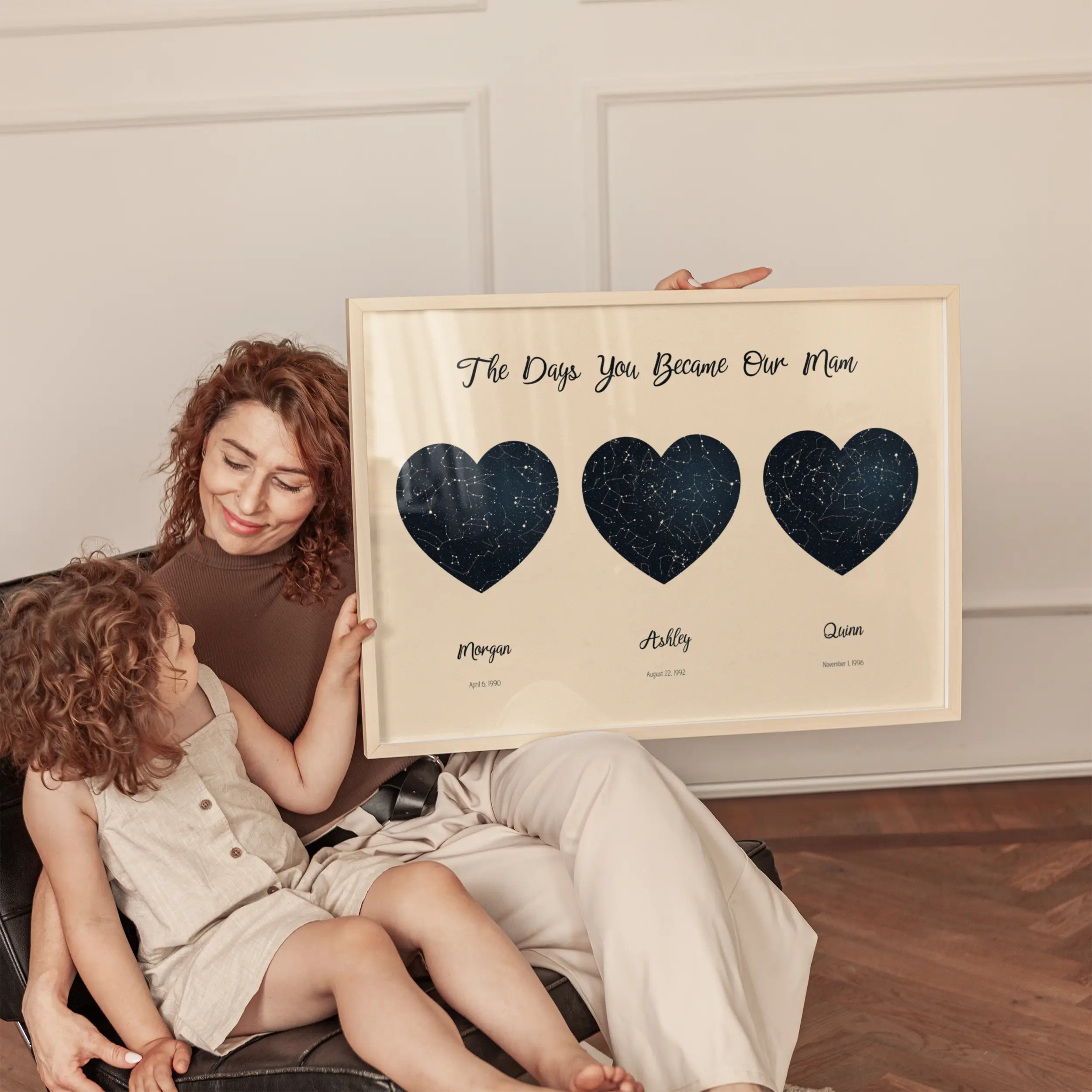 Triple Star Map for Mam is the perfect personalized gift for any mother of three on special occasions! Whether it's Mother's Day, her birthday or Christmas, this unique print is sure to make her day unforgettable.