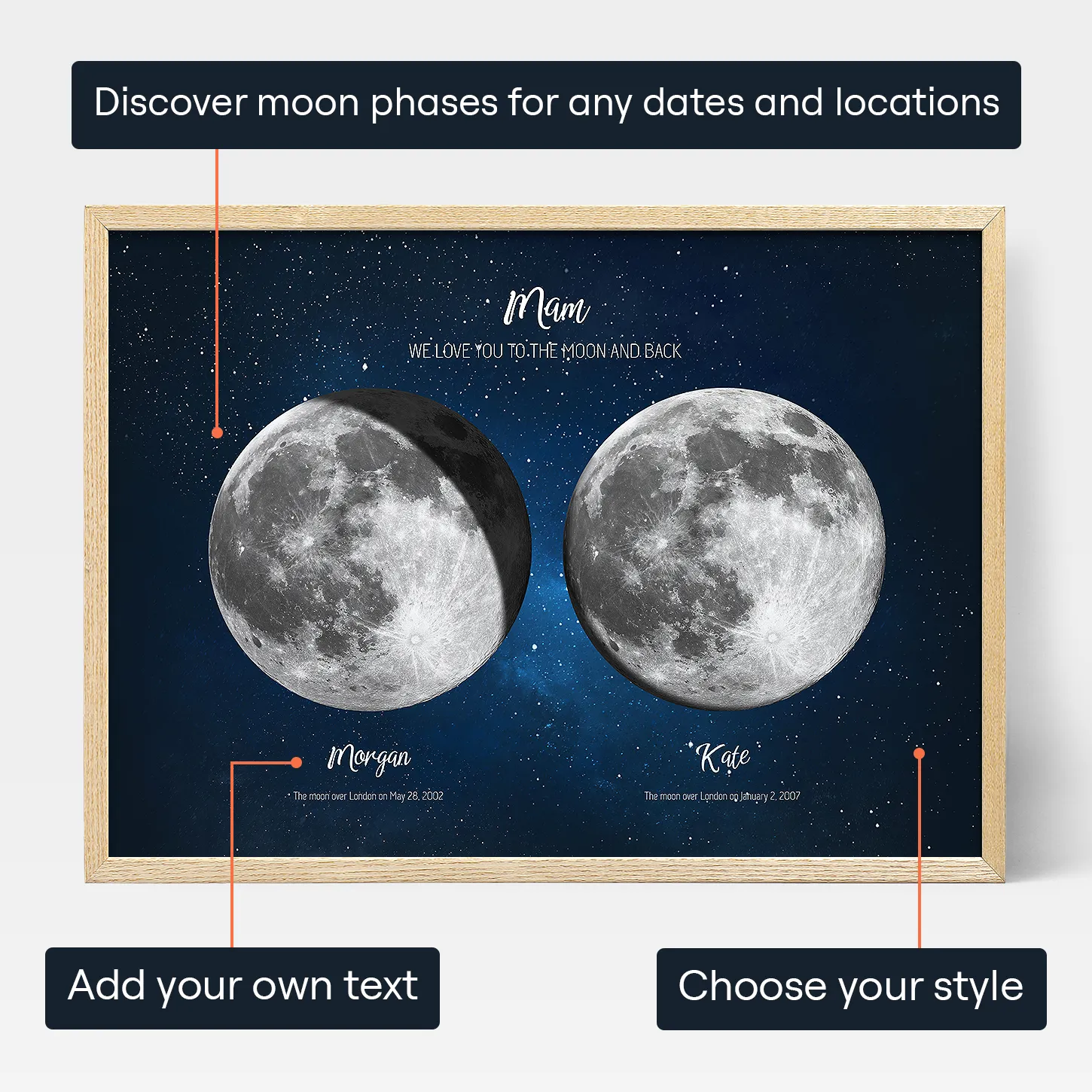 Looking for a special gift for Mom? Two Moons for Mom is a heartfelt and unique gift that will make her smile. This personalised print or canvas showcases the moon phases from two significant dates, such as the birth dates of her children. It's a beautiful way to capture these precious moments and remind her of the special bond she shares with her kids.
