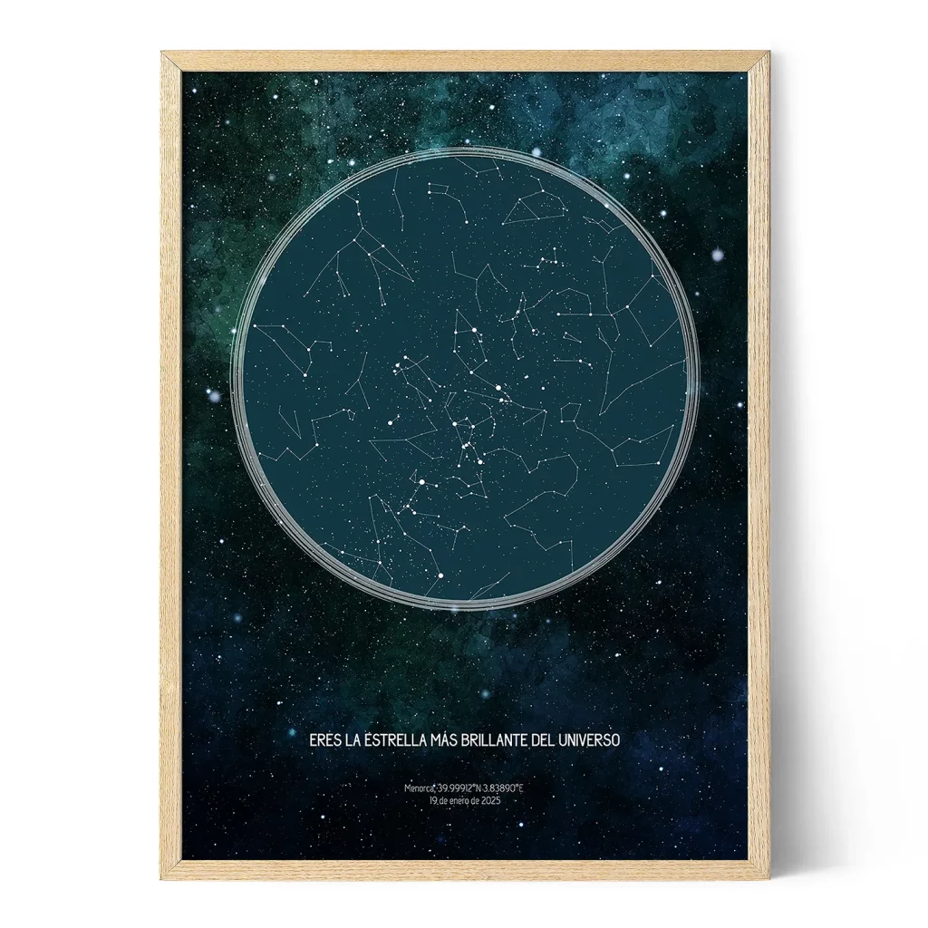 Por último, pero no por ello menos importante, nuestro póster de mapa estelar es uno de los regalos emotivos favoritos para nuevos padres. Al igual que el póster de fase lunar, nuestro mapa estelar es una representación precisa de cómo se veía el cielo nocturno en una fecha y lugar determinado. Ingresa la fecha de nacimiento del bebé y un mensaje personal.