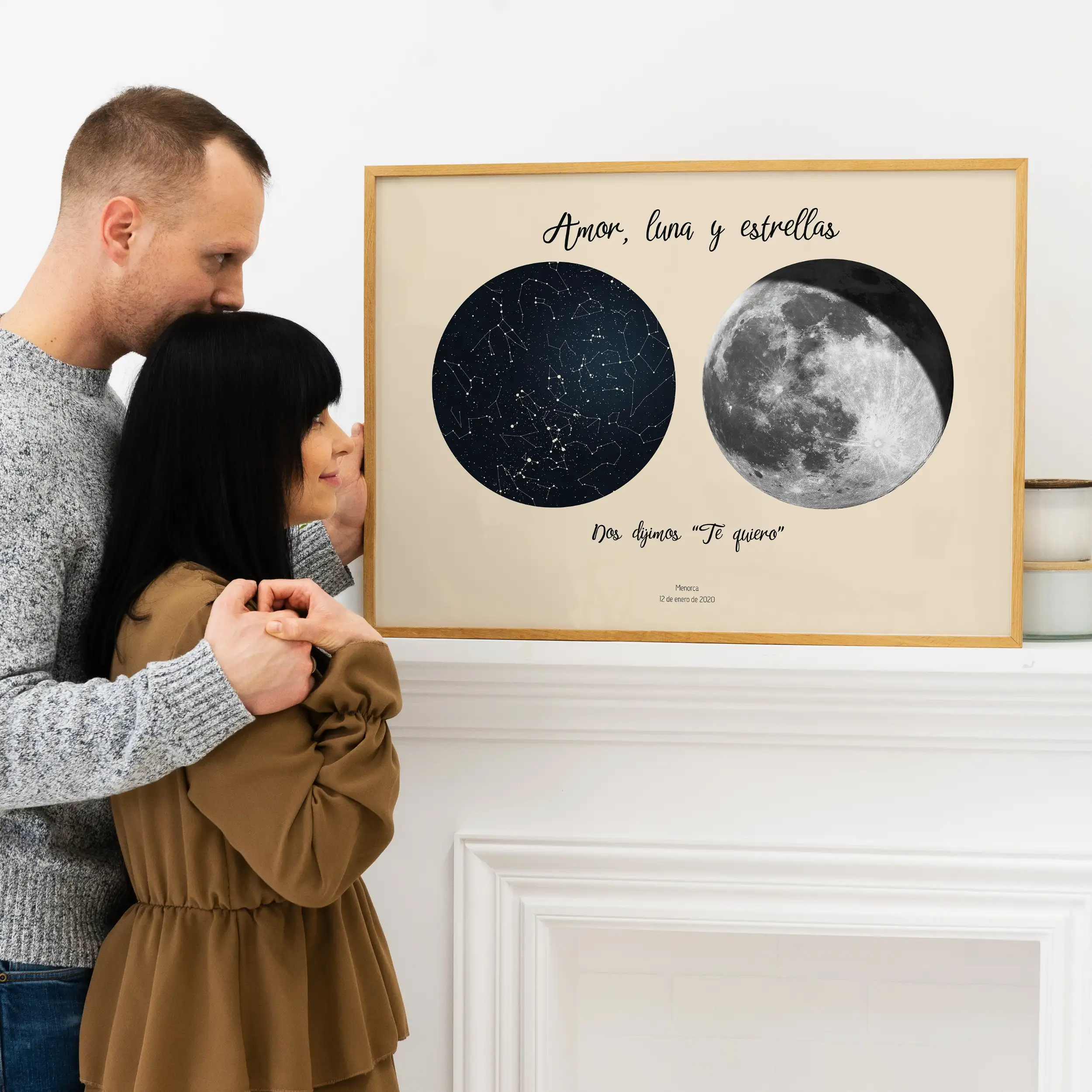 Un póster personalizado que captura la fase exacta en que estaba la Luna y el cielo estrellado de aquella noche que tanto significa para ti. Ya sea la noche en la que os conocísteis, vuestro aniversario o cualquier otro momento especial, esta obra celestial es un homenaje eterno a vuestro amor