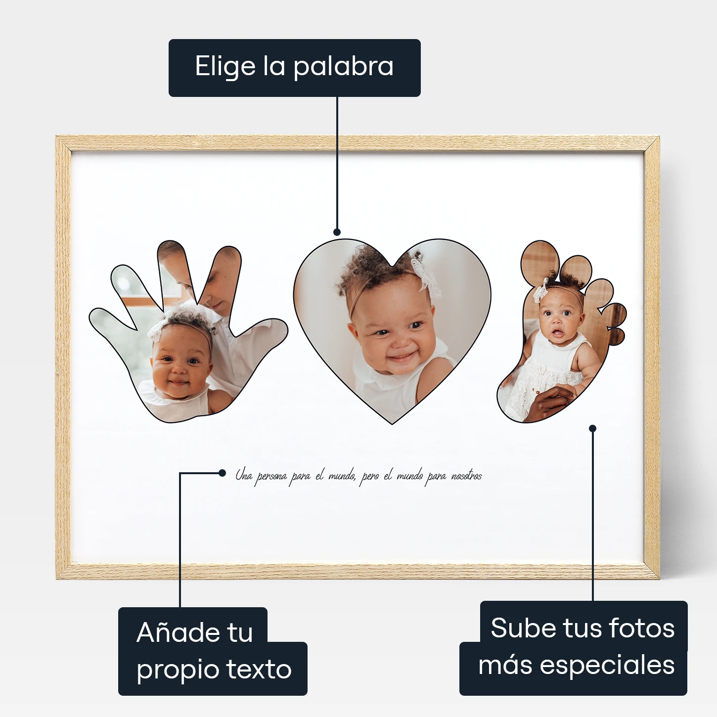 Después de finalizar tu diseño, es hora de subir tus fotos. Puedes subir fácilmente una foto para cada símbolo, y nuestro editor te permite hacer zoom, ajustar la posición e incluso añadir un mensaje personal debajo de las fotos. De este modo, podrás añadir un toque sincero a tu collage. Por último, elige el tamaño y el formato deseados para tu collage de fotos de bebé. Tanto si prefieres un póster enmarcado, un lienzo impreso o un archivo de descarga digital instantánea, tenemos opciones que se adaptan a tus necesidades.