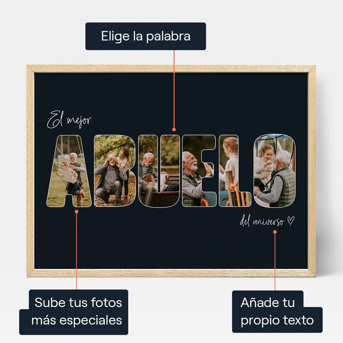 No hay nada como el vínculo especial que comparten un abuelo y sus nietos. Celebra esta relación con el collage fotográfico de letras para el abuelo de Positive Prints: un regalo personalizado que tu abuelo podrá atesorar para siempre. Usa tus fotos favoritas y colócalas en cada una de las letras de la palabra “abuelo”, o si lo prefieres, puedes personalizar la palabra para que diga el nombre o el apodo de tu abuelo, como “abue” o incluso “papá”.