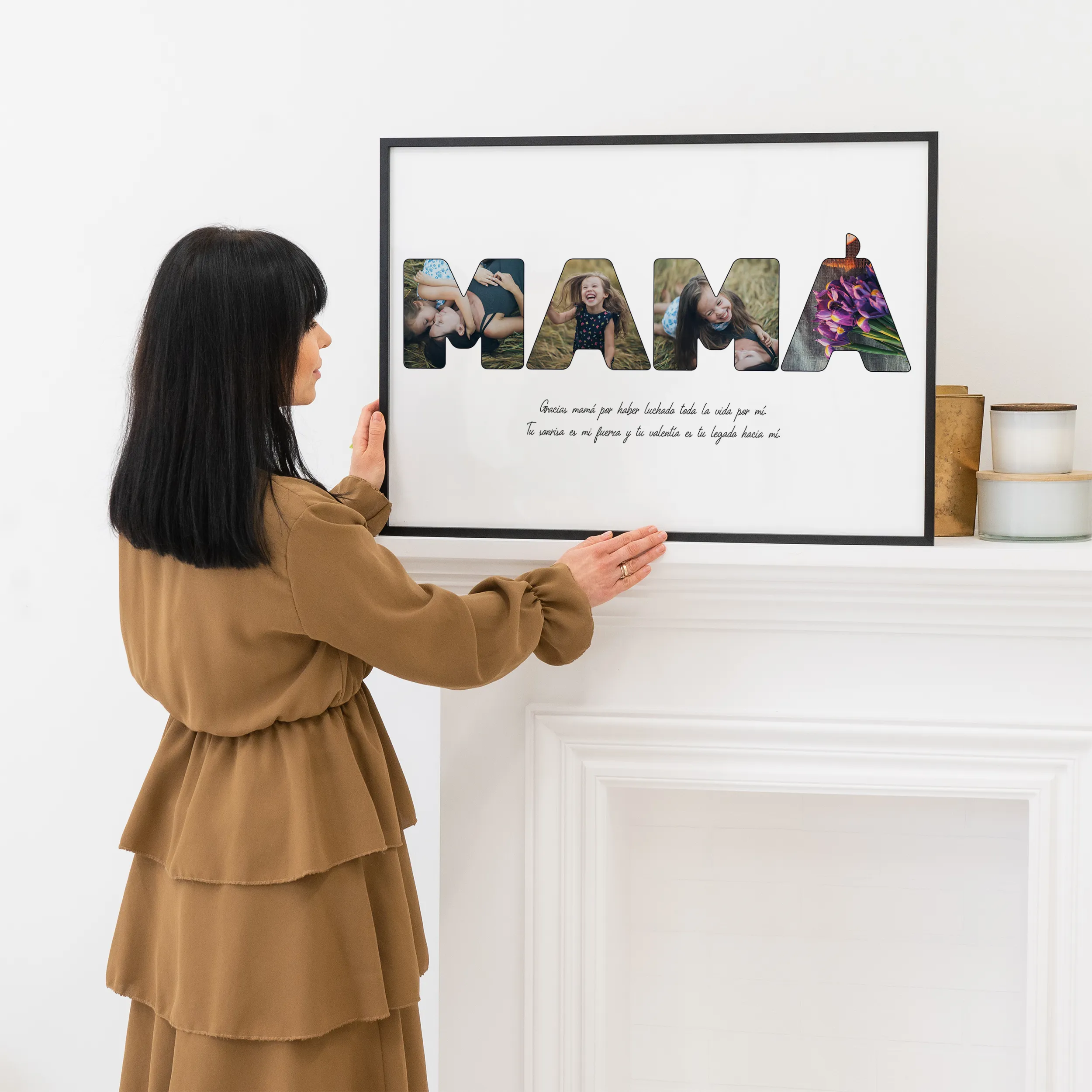 ¿Estás buscando un regalo personalizado y significativo para tu madre? ¡No busques más! Positive Prints celebra el amor entre madre e hijo con el collage fotográfico de letras para mamá: un producto que te permite crear un collage con tus fotos favoritas en la forma de la palabra “mamá”. Puedes escribir más que la palabra “mamá”: puedes elegir la palabra que quieras. Desde “mami” hasta “amor”, usa cualquier palabra personalizada que quieras. Este collage es una forma maravillosa de celebrar y apreciar los momentos y recuerdos que has compartido con tu madre.