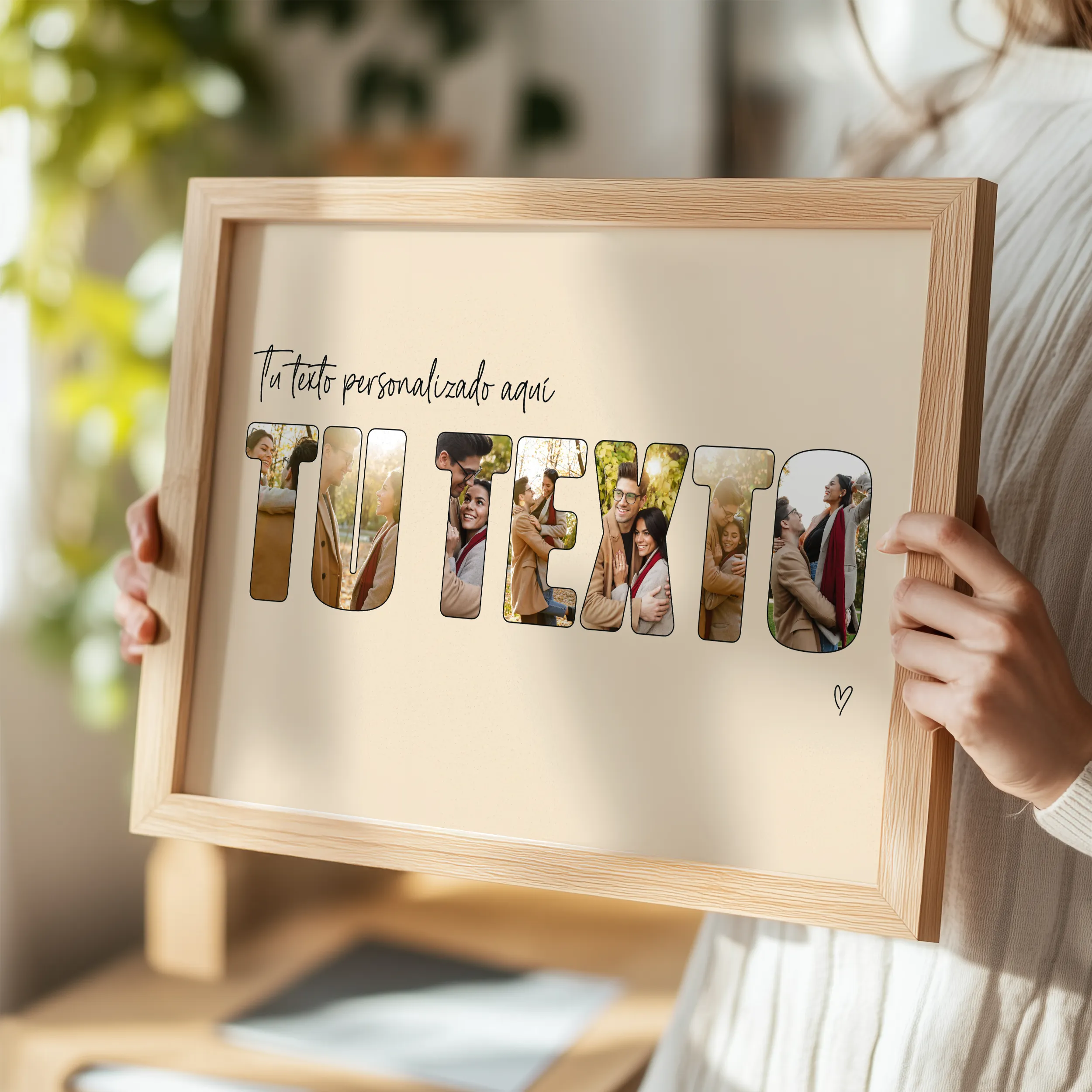 Este tipo de collage fotográfico te permite mostrar fotografías y obras de arte… ¡con letras! Las letras se pueden formar con fotografías individuales, permitiéndote crear una obra personalizada de arte que es visualmente atractiva y muy significativa.