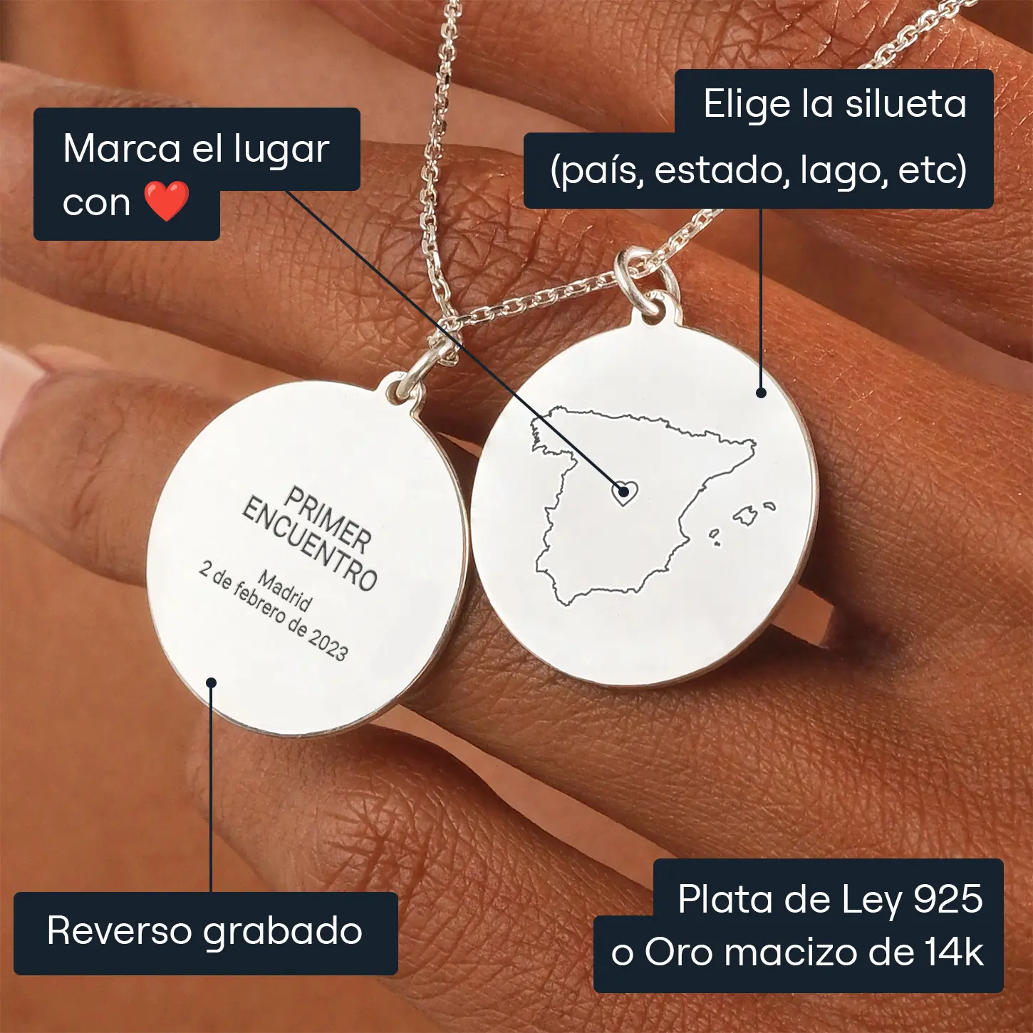 ¿Te has preguntado alguna vez cómo podrías convertir el lugar donde os conocisteis en un regalo especial y único? Pues bien, ¡nuestras joyas personalizadas Dónde nos conocimos son la respuesta! Es como magia que puedes llevar puesta: un collar chulo que siempre te recuerda vuestra conexión especial. Perfecto para regalar en el lugar donde nos conocimos o para celebrar aniversarios.