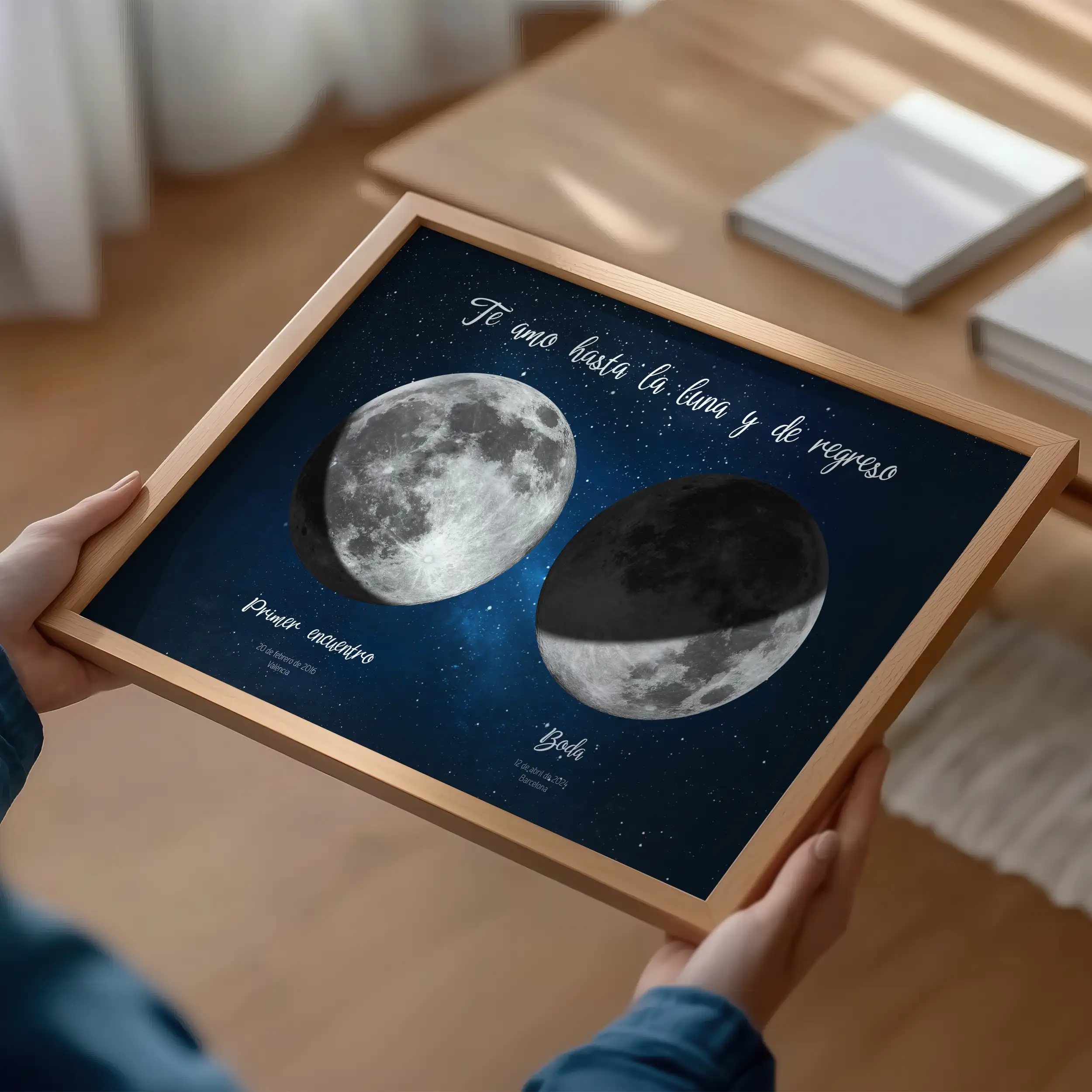 ¿Buscas un regalo único y significativo para tu ser querido? Nuestro Póster Doble Luna es la elección perfecta. Esta impresión personalizada presenta dos fases lunares una al lado de la otra, lo que la convierte en un regalo inolvidable para cualquier ocasión especial.