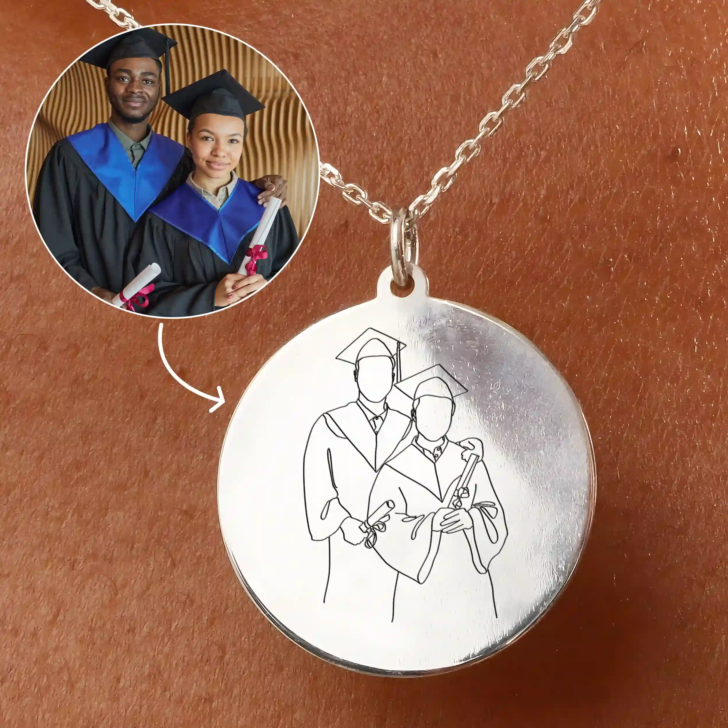 Tu joya personalizada llega en una elegante caja, acompañada de instrucciones de cuidado y un paño de limpieza especial, lo que refleja nuestro compromiso de ofrecer no sólo una joya, sino una experiencia entrañable. Sube una foto de graduación para crear una obra de arte única en la parte frontal del colgante: un bonito recuerdo de este hito tan significativo. En la parte posterior puedes grabar un mensaje personalizado, añadiendo un toque profundamente personal para conmemorar el viaje de educación y crecimiento.