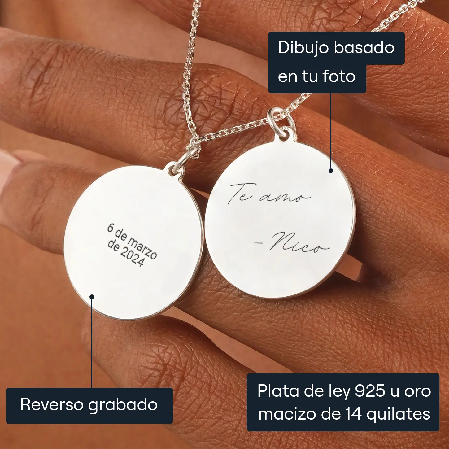 Con nuestro sencillo editor en línea, puedes subir fácilmente una foto de tu texto manuscrito y añadir un mensaje personalizado en la parte posterior del colgante. Cada colgante, ya sea un elegante círculo o una cadena de 45 cm, se somete a un meticuloso grabado láser para garantizar un detalle y una durabilidad perfectos.
