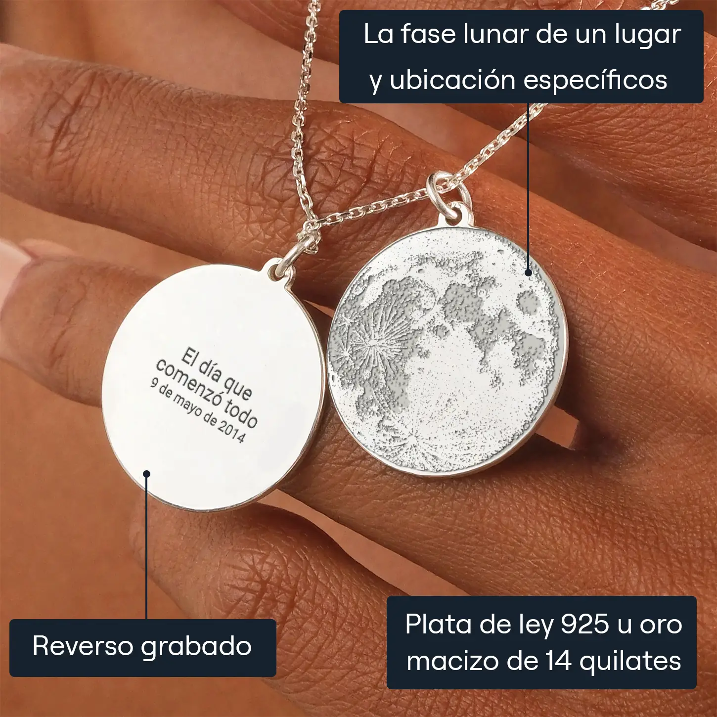 Nuestras joyas personalizadas de fases lunares te permiten crear un colgante único que cuente tu historia particular. Utilizando nuestro editor en línea, sólo tienes que introducir la hora y la fecha exactas de tu momento especial. Ya sea el día en que conociste a tu alma gemela, la fecha de tu boda o cualquier otra ocasión memorable, capturaremos la fase lunar de ese preciso momento.