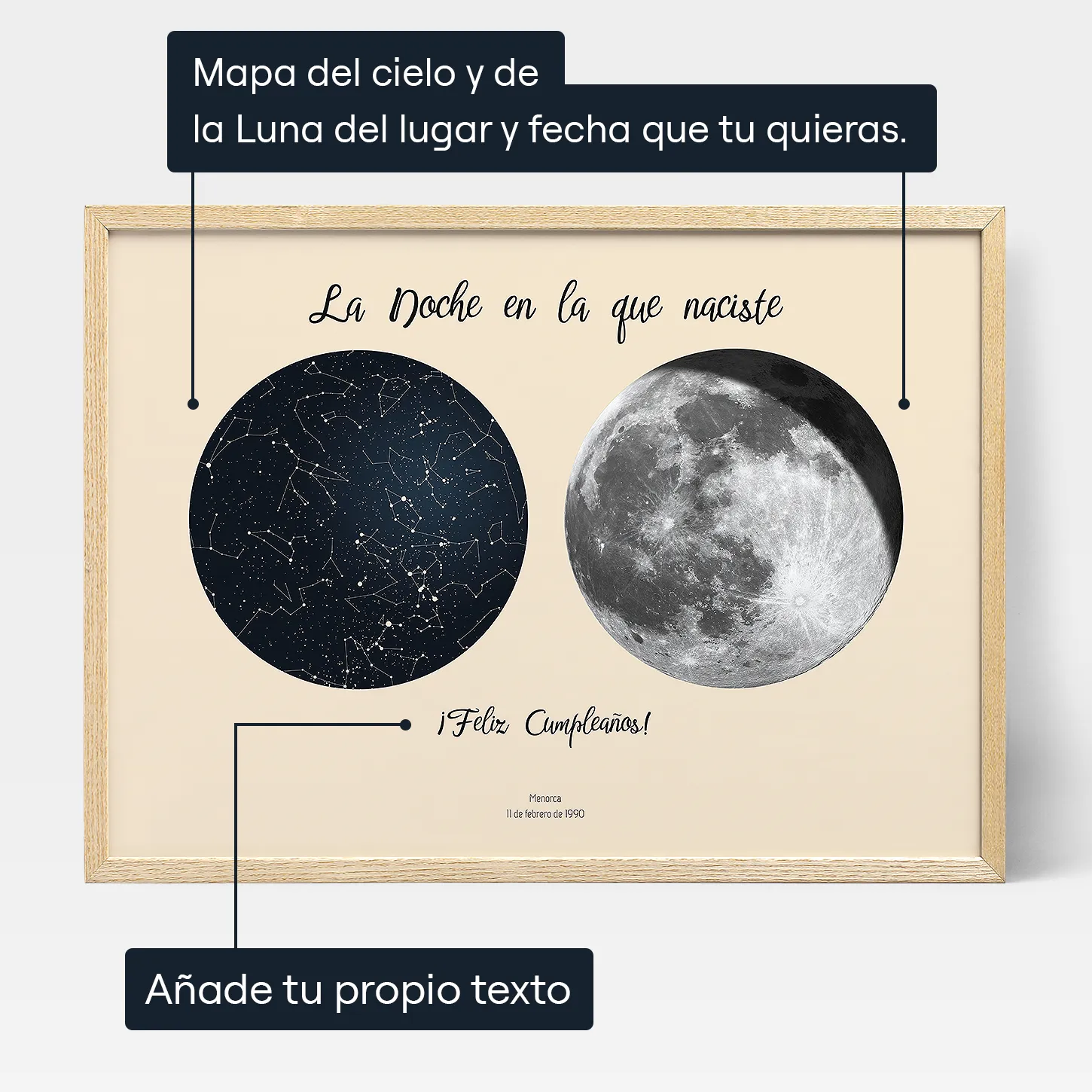 Un póster personalizado que captura la fase exacta de la luna y el firmamento de la noche en que naciste