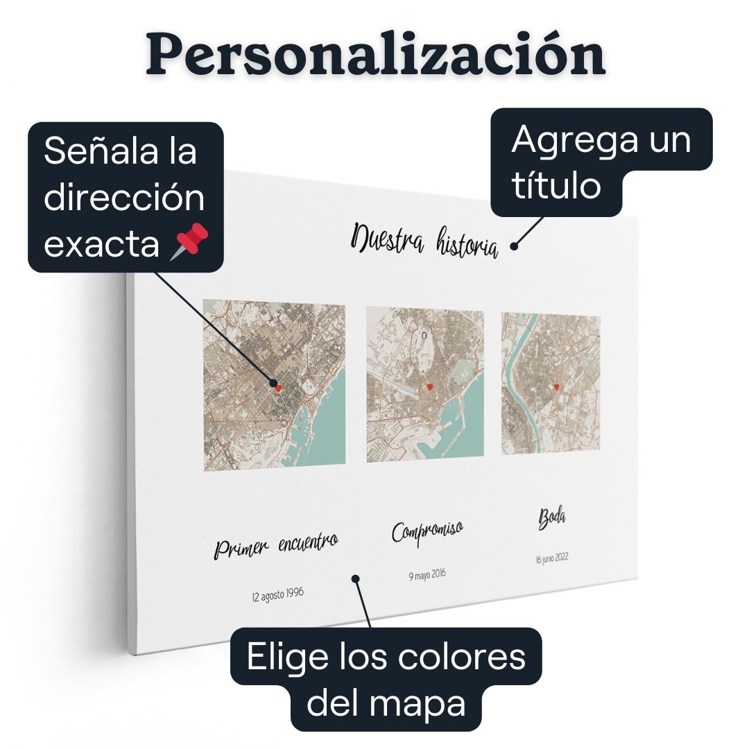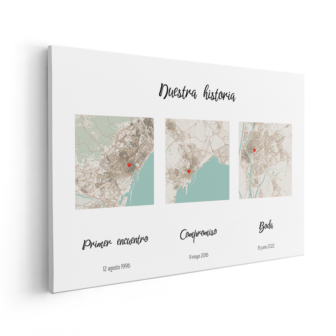 Elegir el formato adecuado es fácil con nuestra variedad de opciones de lienzos, que garantizan que tu mapa quedará increíble en cualquier pared. Hacer un pedido es sencillo: sólo tienes que visitar nuestro sitio web, introducir las tres ubicaciones, personalizar tus mapas, añadir tus títulos y textos personalizados, elegir el formato del lienzo y hacer el pedido. Nosotros nos encargamos del resto, asegurándonos de que tu lienzo se elabore y entregue con esmero.