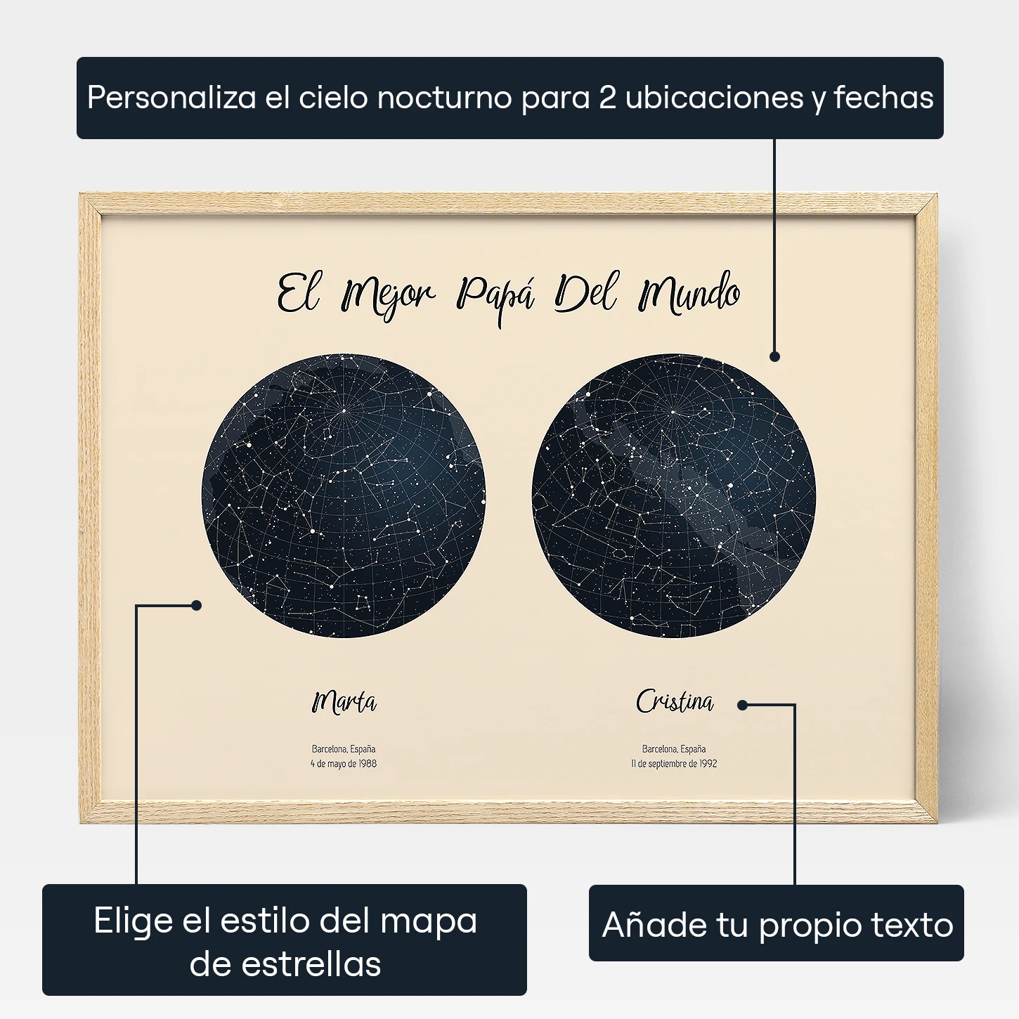 Cada impresión puede personalizarse con la fecha, la hora y la ubicación de cada nacimiento, así como el nombre de cada uno de los hijos. El resultado es una impresionante obra de arte que celebra la alegría y el amor que viene con la paternidad.