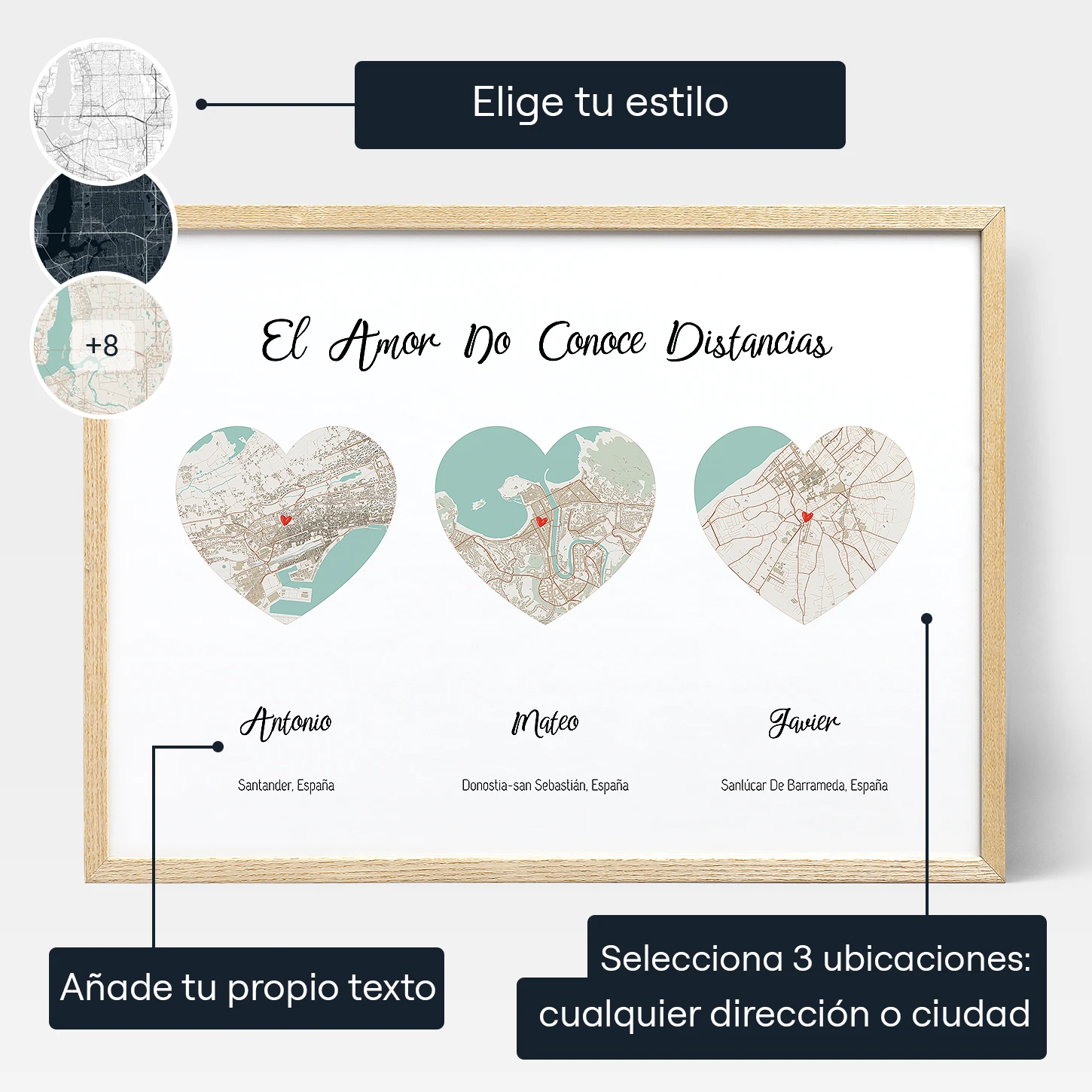 Mamá es como un hogar. Este hermoso mapa personalizado te ayudará a mantener a mamá cerca de tu corazón. Este mapa triple te permite personalizar tres mapas pequeños dentro de la misma impresión. ¡Las posibilidades son infinitas!