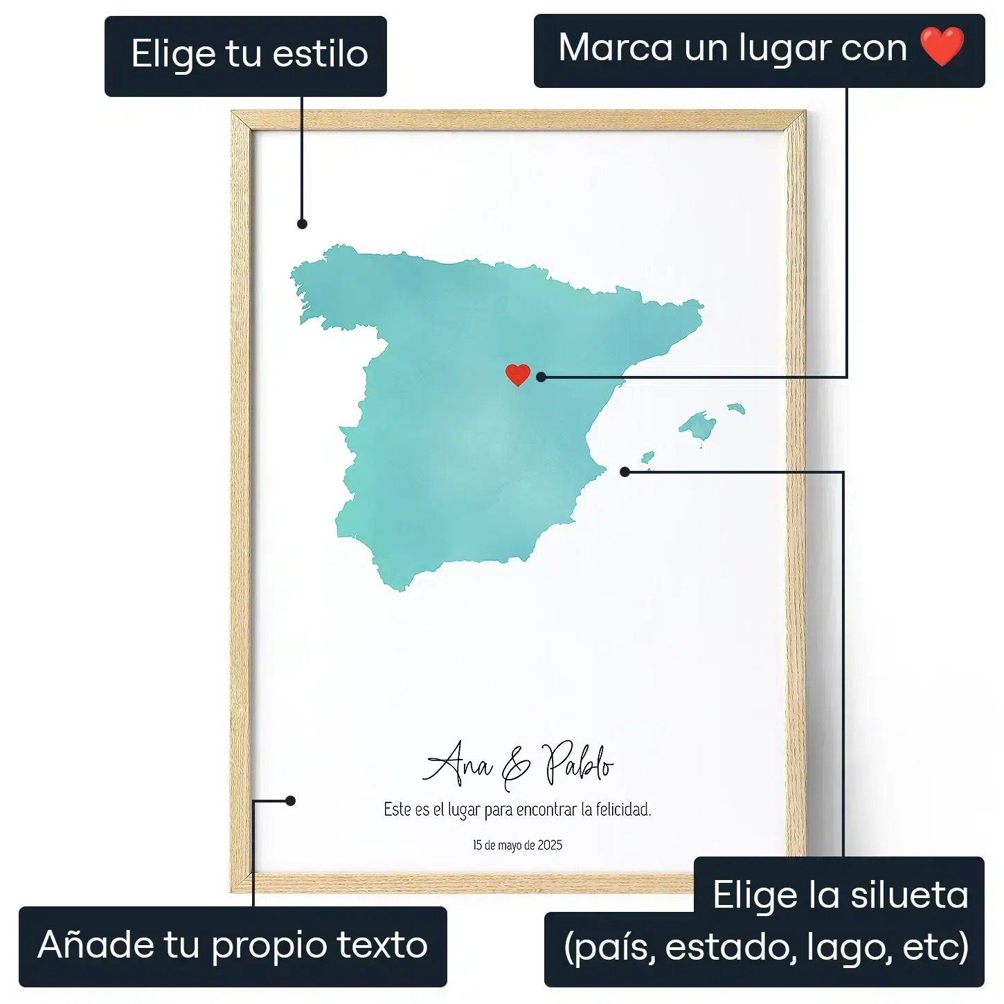 Nuestro Mapa de acuarela personalizado es una forma única y creativa de capturar recuerdos y lugares preciados. Empieza seleccionando el estilo de mapa y los colores que prefieras. Elige entre nuestros temas de acuarela preestablecidos o deja fluir tu creatividad personalizando el fondo y los colores del terreno. A continuación, elige una ubicación de nuestra extensa lista, ya sea un país, un estado o incluso el mundo entero. La verdadera magia se produce cuando añades un marcador con forma de corazón para señalar un lugar significativo, como el lugar donde os conocisteis, os prometisteis o os casasteis. Debajo del marcador, puedes incluir un mensaje sincero, una frase dulce o una cita inspiradora. Por si fuera poco, puedes decidir si lo quieres como impresión enmarcada, lienzo o archivo digital.