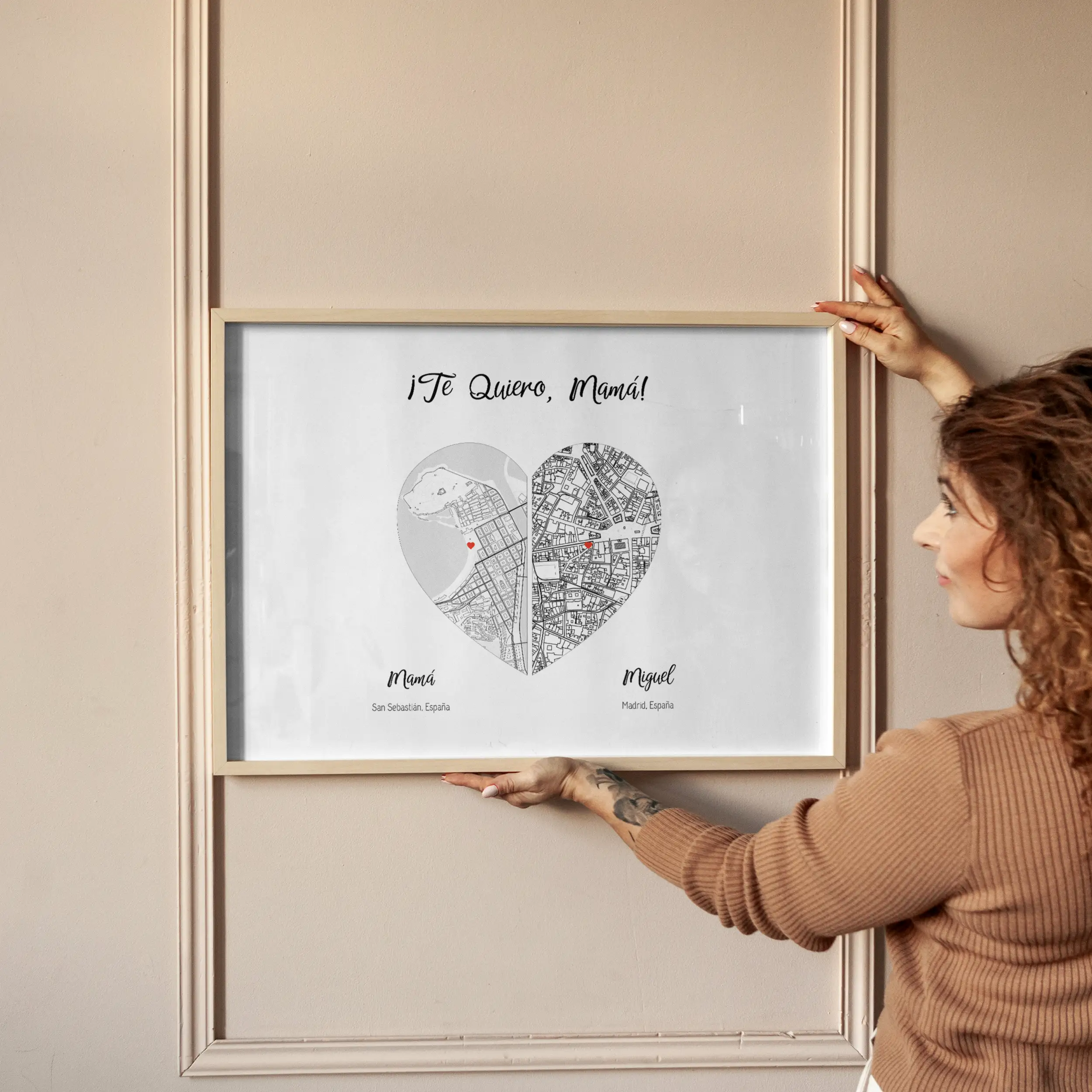 ¡Elige entre un corazón dividido en dos mapas, dos corazones, dos cuadrados o dos círculos y personaliza los colores para que tu regalo se adapte a los gustos de tu madre! Marca tu dirección exacta como la de tu madre con alfileres de corazón. También puedes agregarle un texto personalizado, donde puedes poner sus nombres, direcciones o alguna cita o frase que tenga un significado especial para los dos.