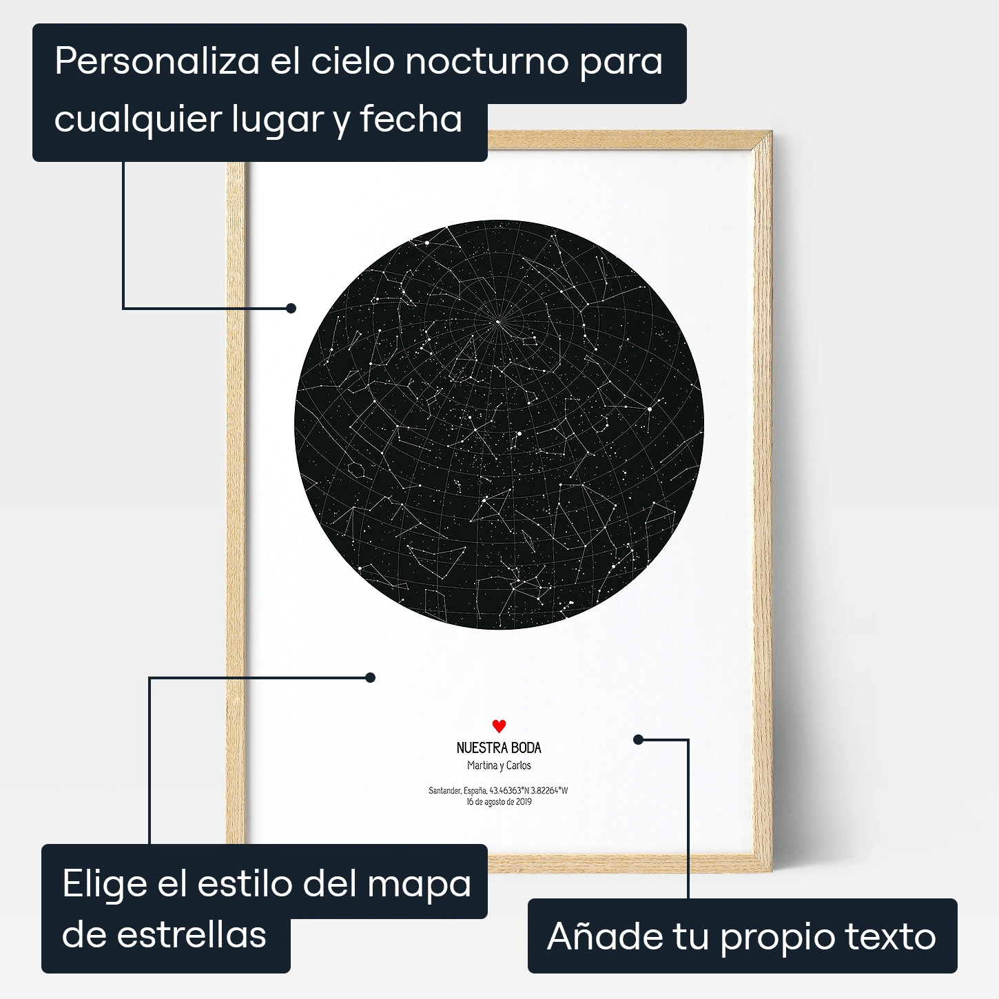 Sin duda, un mapa estelar es un regalo único. Puedes personalizar e imprimir tu póster según tus necesidades y los detalles que quieras incluir. Estas impresiones son ideales para cada ocasión y son excelentes regalos, para ti y para los demás.