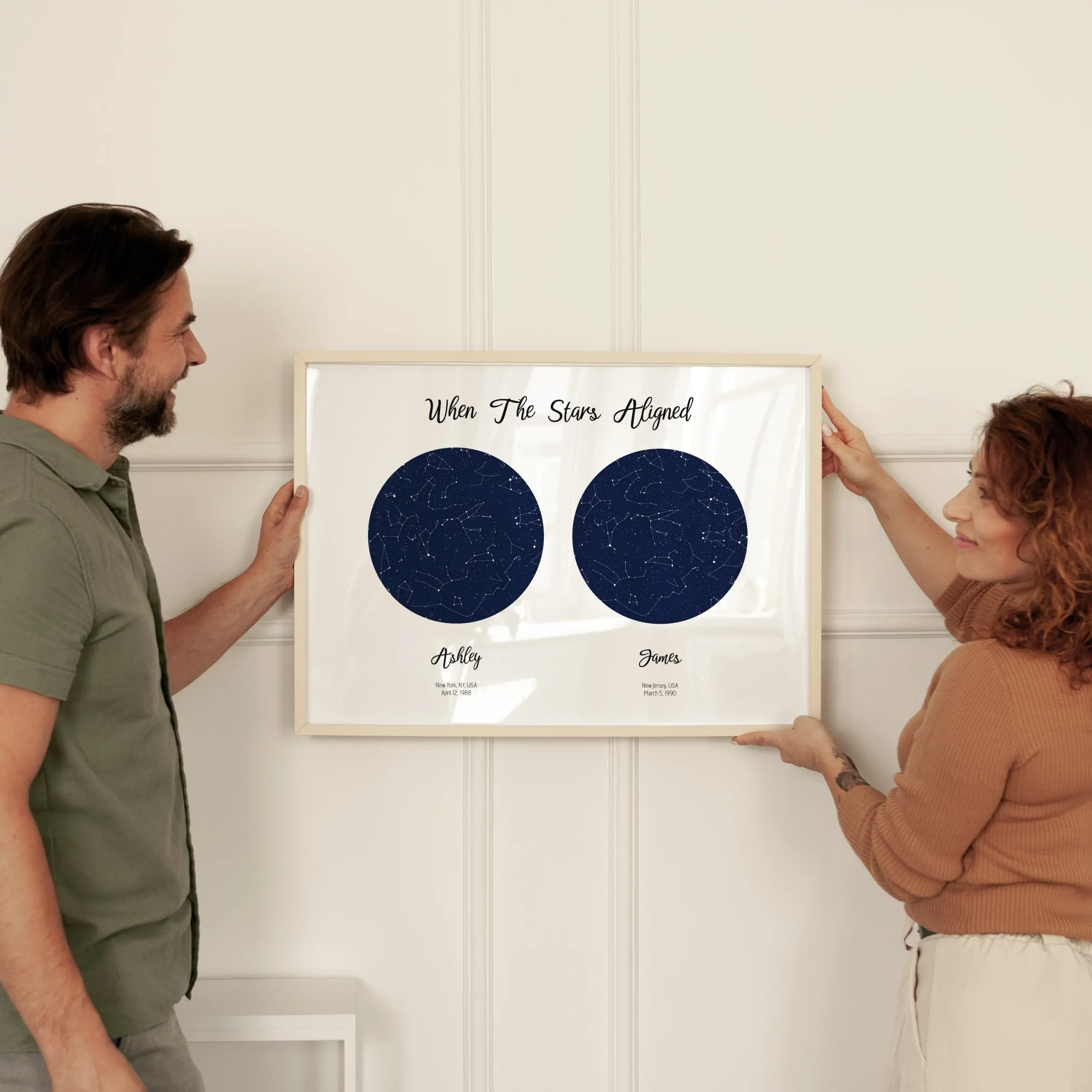 “Cuando las estrellas se alinearon” es un mapa estelar doble que puedes regalar en aquellas ocasiones especiales donde necesitas un detalle verdaderamente único y personal. Esta impresión muestra dos mapas estelares personalizados, que representan los cielos estrellados de dos días diferentes, y que además simbolizan algo especial para ti y tu ser querido. Quizás sea el día en que se conocieron y el día en que se casaron o dos cumpleaños que son importantes para ti. ¡Las posibilidades son infinitas! Al final tendrás un regalo hermoso que esa persona especial apreciará por la eternidad.