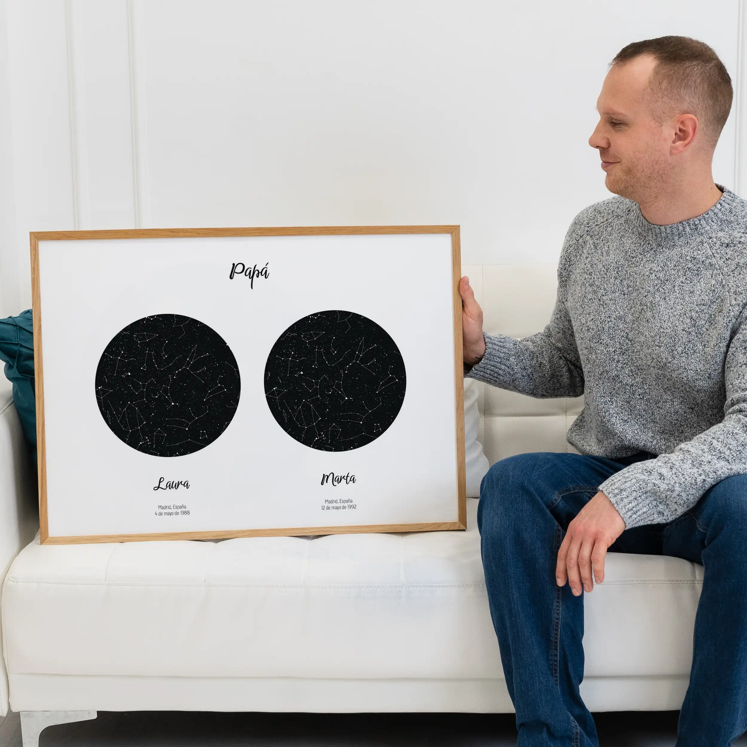 El mapa estelar doble para papá es un increíble regalo que captura los momentos más memorables en la vida de un padre, como el nacimiento de sus hijos, de manera hermosa y personalizada. Este mapa estelar le recordará a tu padre todos los momentos especiales que ha vivido, y los atesorará para siempre.
