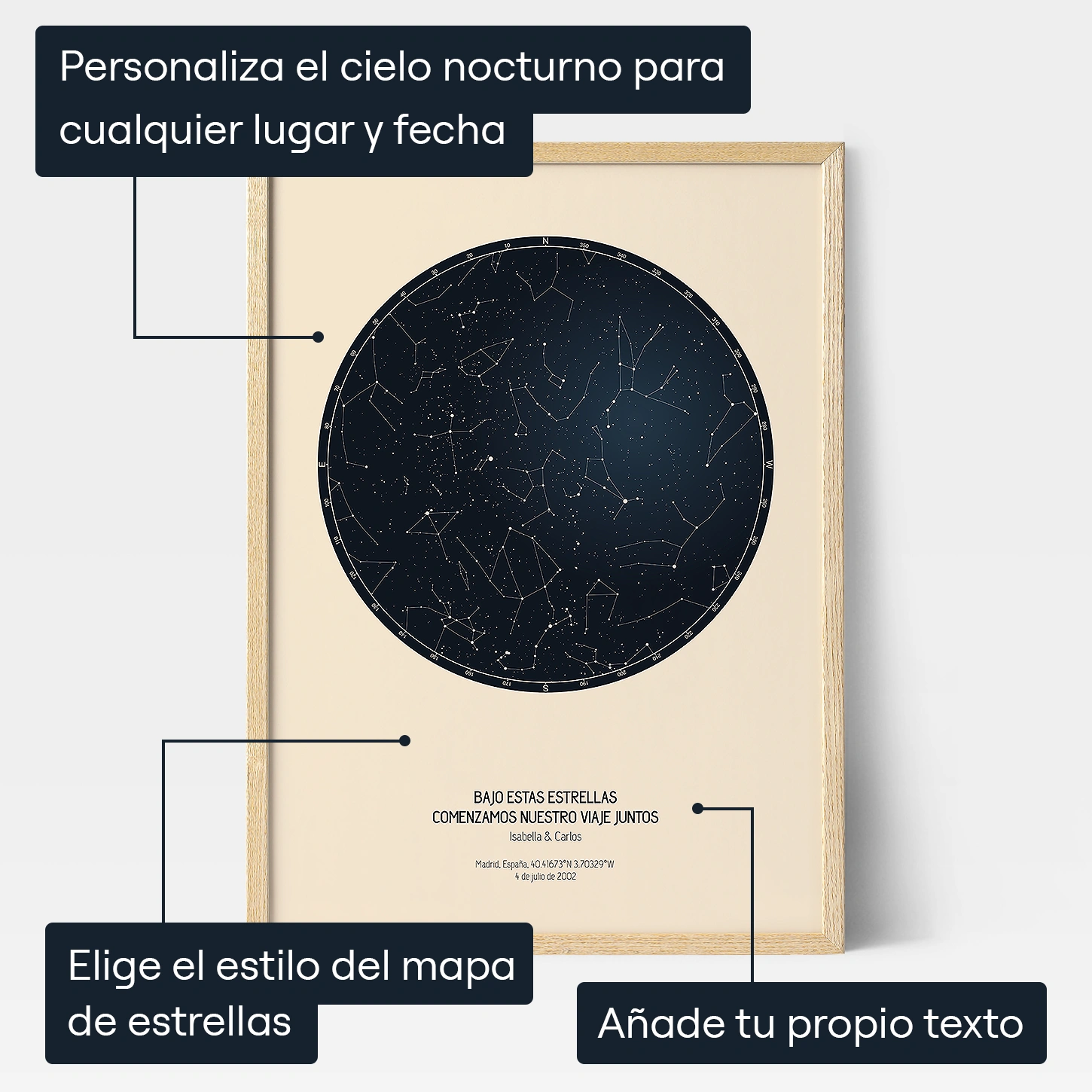 Un Mapa Estelar Personalizado es una réplica del cielo nocturno en una fecha y lugar específicos. Específicamente, captura la magia de las estrellas utilizando datos astronómicos del satélite Hipparcos. Por lo tanto , inmortaliza momentos especiales de tu vida para siempre.