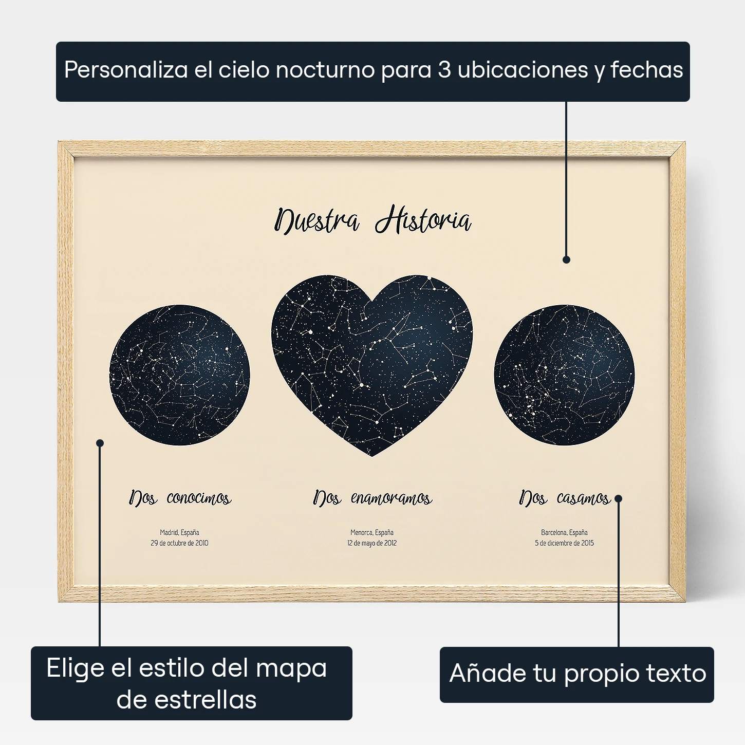 ¡Crear tu mapa estelar triple de “nuestra historia de amor” es muy fácil! Con nuestro editor en línea, puedes elegir el diseño y los colores que más te gusten. ¡Tenemos diseños circulares o en forma de corazón! Selecciona las fechas y ubicaciones de cada uno de tus mapas y podrás obtener una vista previa de tu obra de arte en cada paso del proceso de diseño. Por último, elige entre una variedad de formatos y tamaños para que tu regalo sea el detalle perfecto para conmemorar alguna ocasión especial.