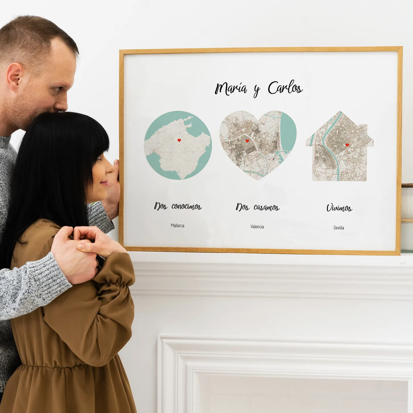 ¿Cuáles son los tres lugares más importantes del mundo? El lugar donde se conocieron, donde se casaron y donde viven. Cada uno de estos lugares atesora muchos momentos maravillosos para ustedes; tienen tanta suerte de haber coincidido en la vida y poder compartir sus vidas juntos. ¡Conmemora cada uno de estos lugares especiales!