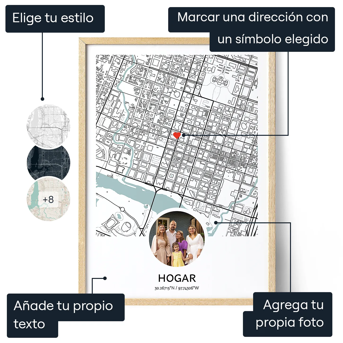 Nuestro creador online hace que la personalización sea sencilla y divertida. Elige la forma y los colores del mapa, seleccionando entre los esquemas de color predefinidos o experimentando con tus propias opciones. Introduce la nueva dirección, acerca y aleja el zoom para obtener la vista perfecta, y añade un marcador en forma de corazón para señalar el lugar exacto. Sube una foto bonita y añade un mensaje significativo como "Nuevo hogar".