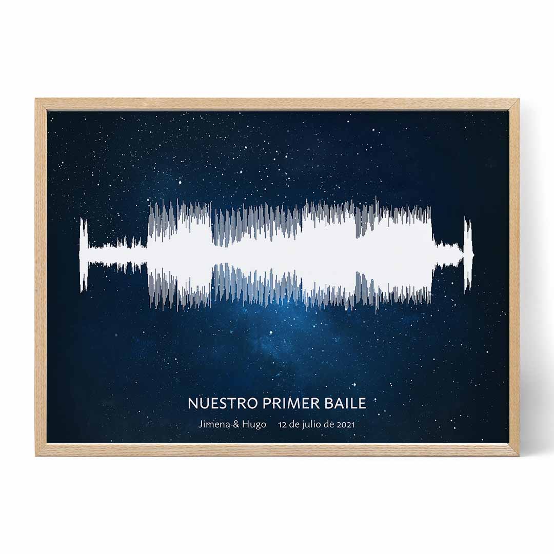 Ya sea que hayan pasado años desde el día de su boda o que apenas hayan decidido comprometerse de por vida, podemos convertir su primera canción como pareja en una obra de arte que sin duda adornará las paredes de su hogar. Para hacerlo, solo necesitas subir el archivo de audio de tu canción y elegir una de nuestras maravillosas plantillas para comenzar a crear la obra perfecta. Explora nuestras paletas de colores y diseños, y mira cómo tu diseño va cobrando vida en tiempo real. Agrega detalles, como el nombre de la canción, una frase especial, la fecha de su boda o cualquier cosa que te ayude a contar su historia.
