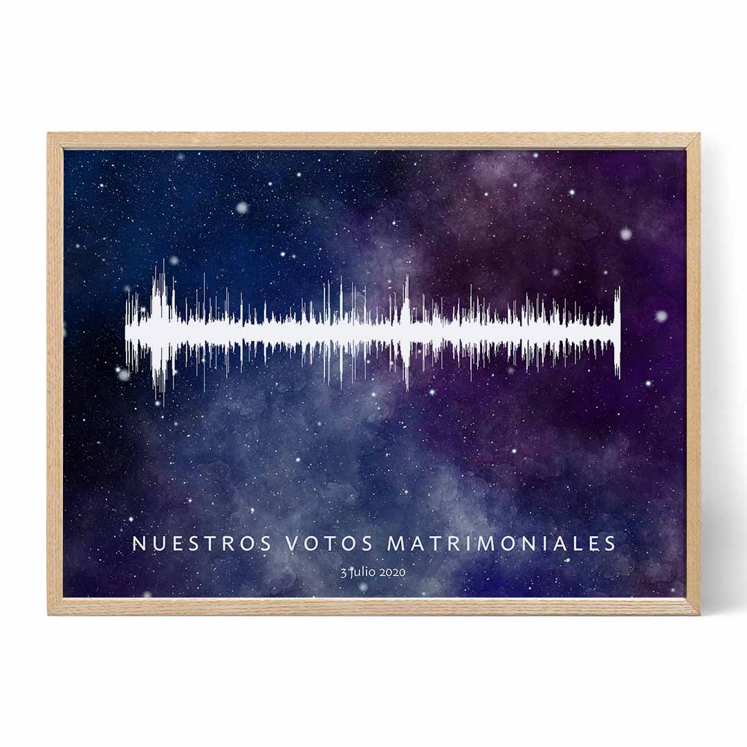 Sin duda, el día de tu boda fue uno de los mejores días de tu vida. Ahora tienes el poder de inmortalizar un fragmento importante de ese día: el intercambio de votos. Nuestra onda sonora personalizada transforma tu archivo de audio en una fascinante representación visual meticulosamente diseñada para reproducirse en tiempo real. Comparte tus votos en tu hogar, adornados de una de las maneras más distintivas que puedas imaginar.