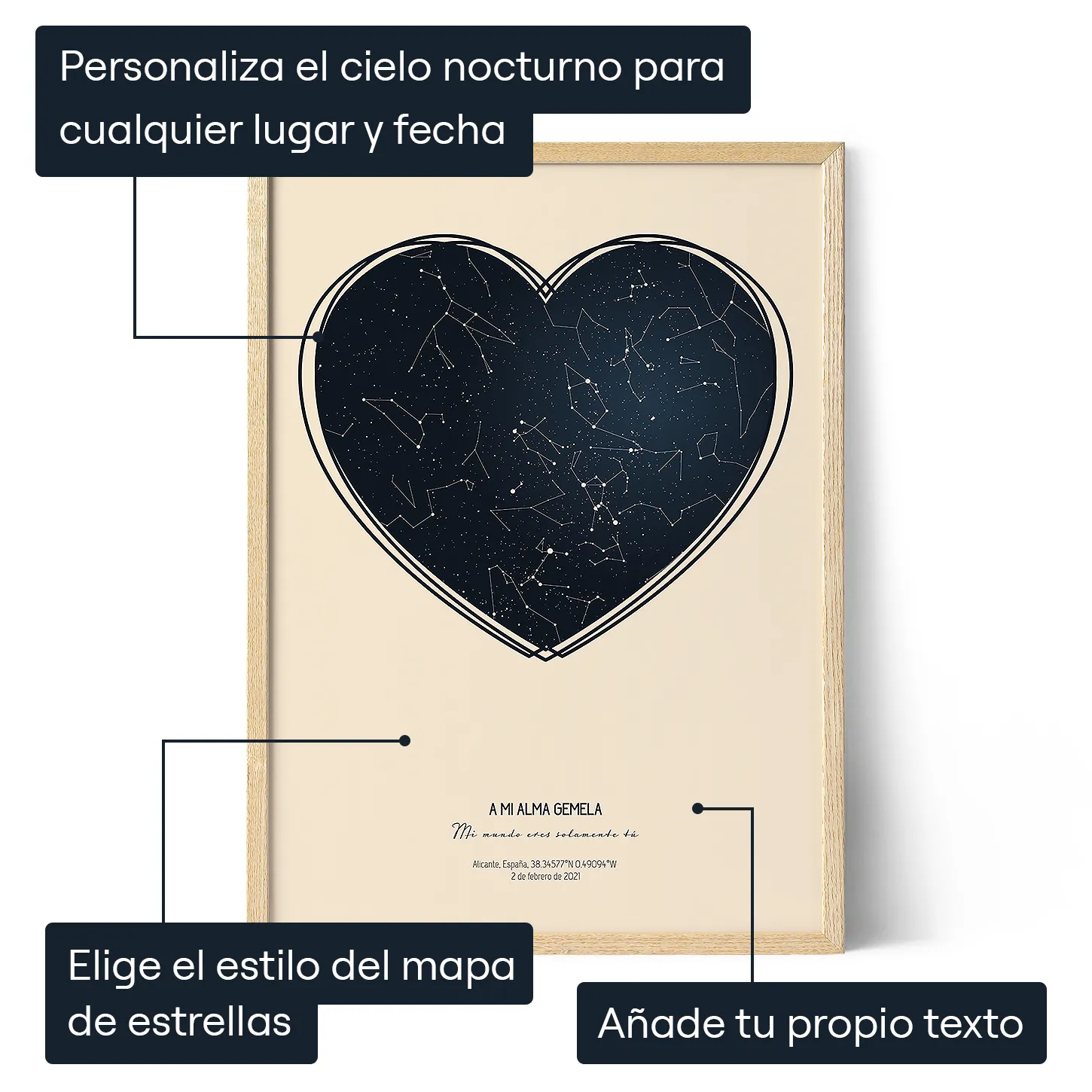 ¿Estás buscando un regalo único y romántico para tu alma gemela? ¡No busques más porque “Para mi alma gemela” es el detalle perfecto para esa persona especial! Este póster o lienzo personalizado muestra el cielo nocturno de aquella fecha y lugar especiales, además de un texto personalizado por ti. Incluso puedes elegir los colores favoritos de tu alma gemela y colocarlos en tu póster. Ya sea que pidas un póster impreso, un póster enmarcado, un lienzo o un archivo digital, tu alma gemela atesorará este detalle por siempre. ¡No esperes más y pide tu póster “Para mi alma gemela” hoy mismo!