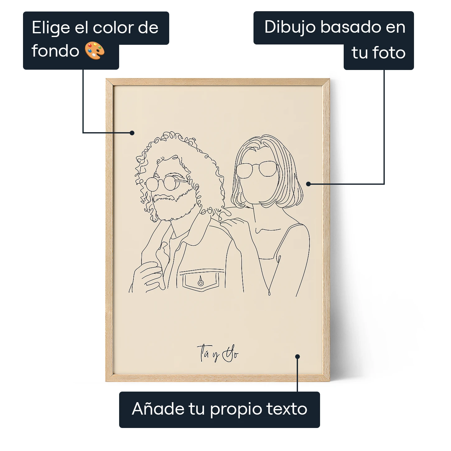 Comparte una foto que encierre la magia de vuestra relación. Nuestros artistas dibujarán meticulosamente a mano la obra de arte, asegurándose de que refleje el romanticismo y la conexión entre tu pareja y tú.