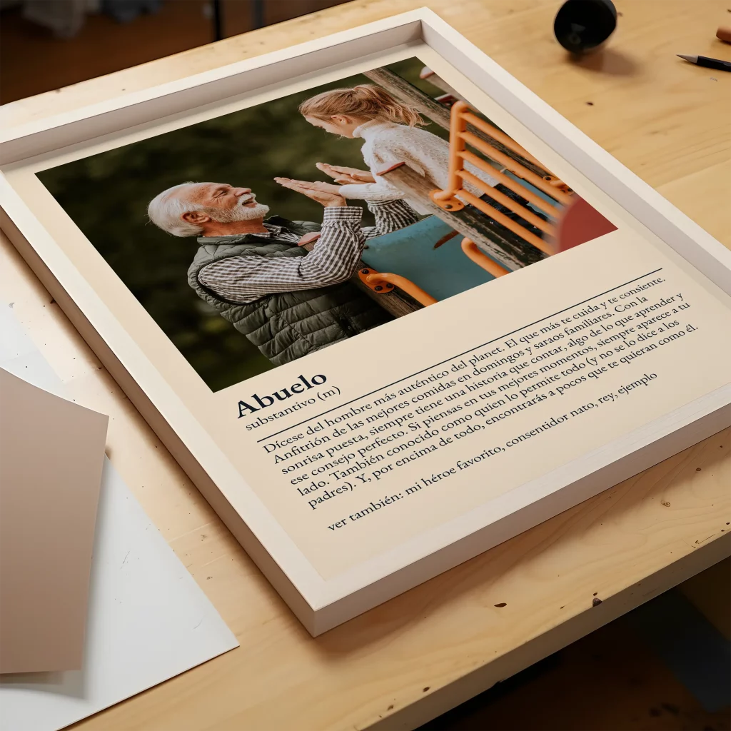 Demuestra a tu abuelo lo mucho que significa para ti con un Póster de la Definición del Abuelo. Es una forma hermosa y personal de celebrarlo, captando su esencia de una forma que las palabras por sí solas no pueden expresar. Este regalo único será un complemento muy apreciado en su hogar, que le recordará constantemente el vínculo especial que compartís.