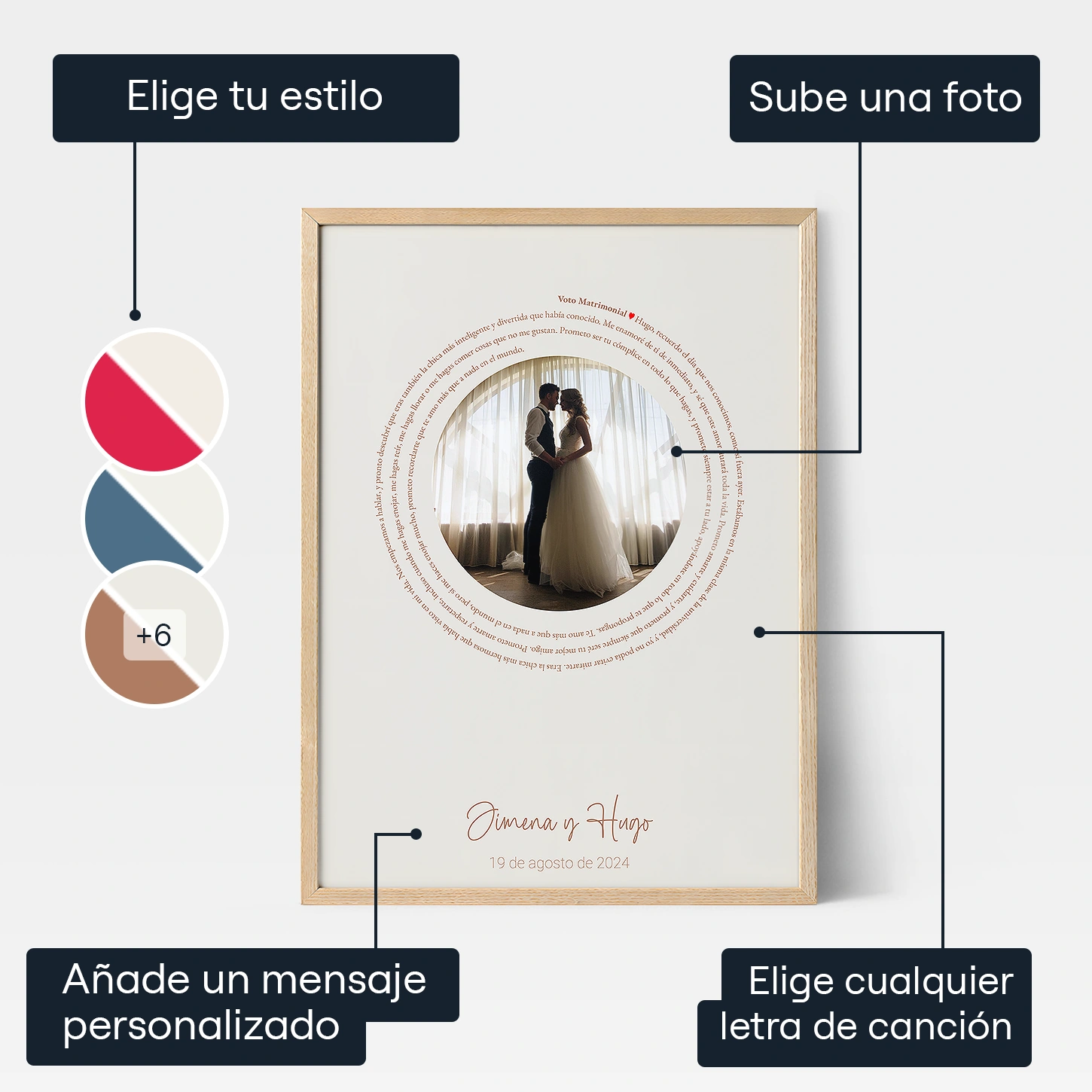 El Arte de los Votos Matrimoniales con Foto es ideal para cualquier ocasión especial. Ya sea una boda, un aniversario o simplemente un gesto de amor, esta obra de arte es una forma significativa de celebrar y preservar las promesas que os hicisteis el uno al otro. Es perfecta para las parejas que quieren recordar el día de su boda y los votos especiales que marcaron el comienzo de su viaje juntos.