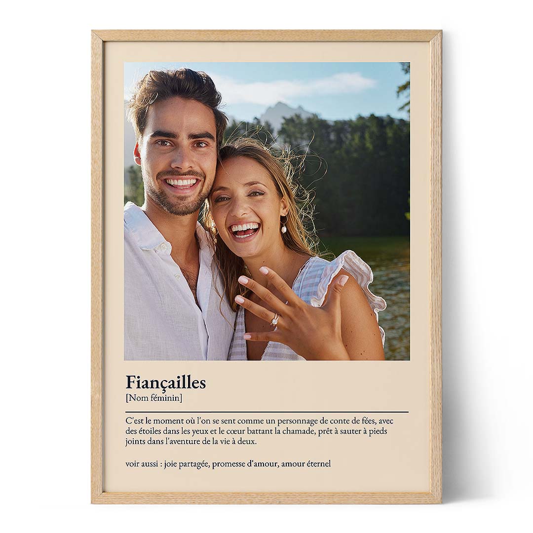 Vous cherchez un moyen unique et sincère de célébrer des fiançailles ? Notre Affiche Définition de l'Engagement est le cadeau personnalisé parfait. Capturez la joie de ce moment spécial avec une définition personnalisée et une photo qui touche vraiment le cœur.