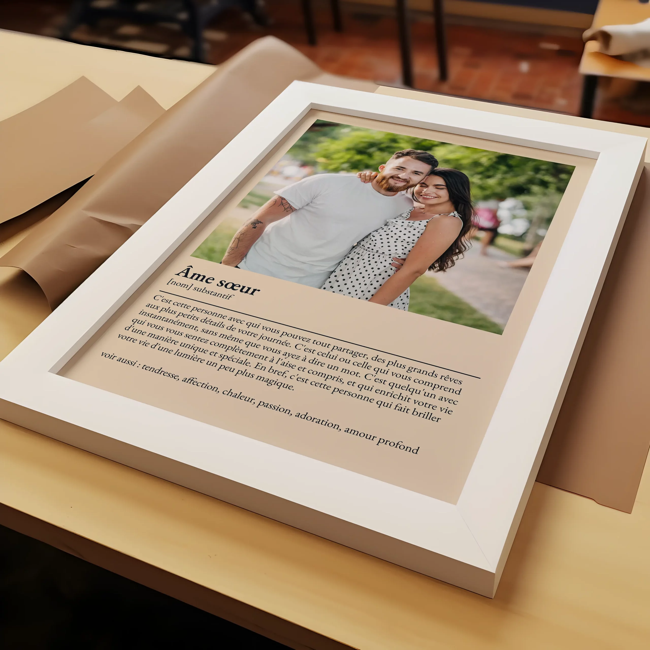 Que ce soit pour un anniversaire, un anniversaire de mariage ou toute autre occasion spéciale, notre Poster de Définition d'Âme Sœur est un cadeau attentionné pour célébrer votre lien unique. Imaginez la joie sur le visage de votre âme sœur lorsqu'elle recevra une affiche personnalisée qui capture l'essence de votre connexion.