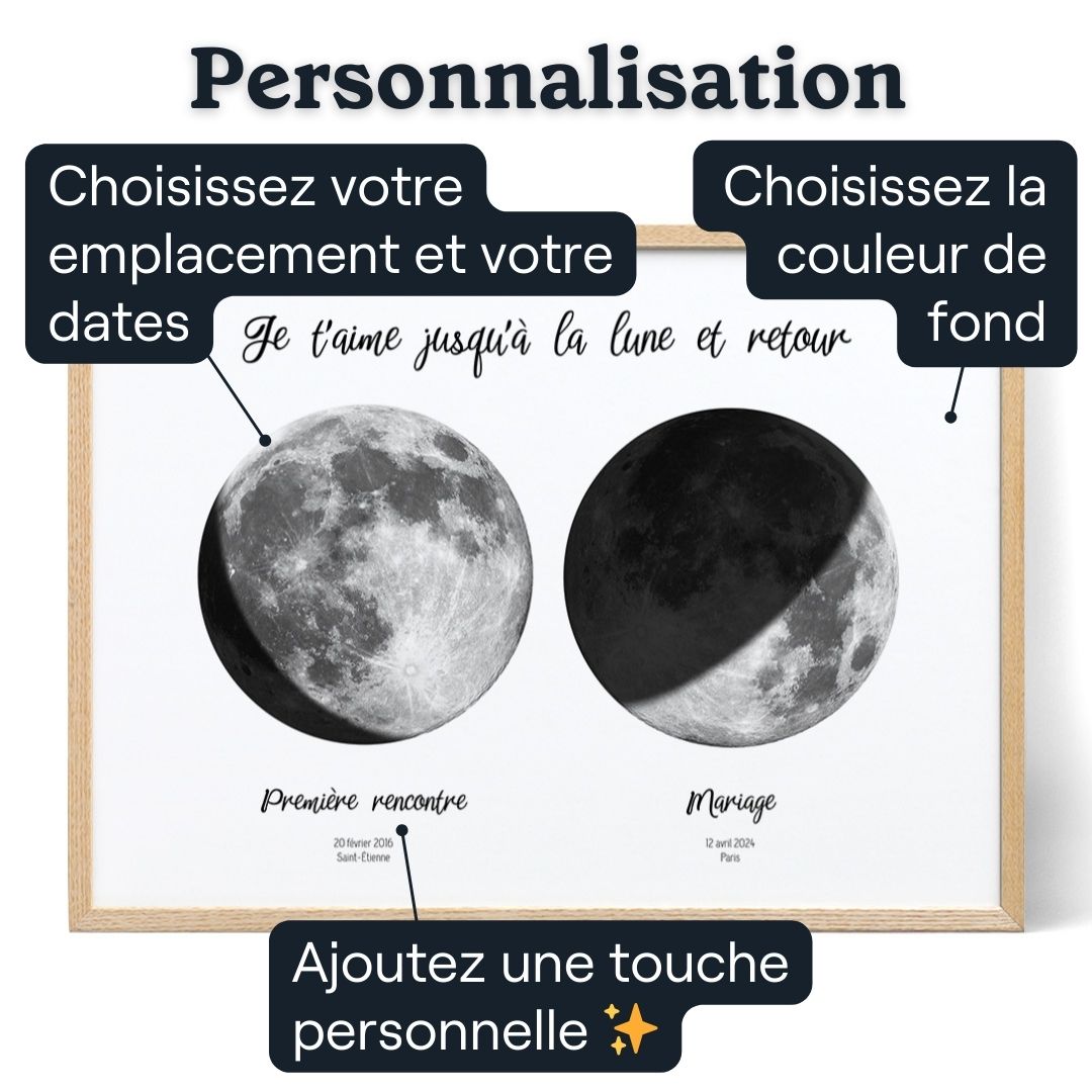 Une fois le titre défini, saisissez les dates et les lieux pour chaque phase de la lune. Cela révélera comment la lune apparaissait les jours où vous et votre âme sœur êtes nés. Sous chaque lune, vous pouvez ajouter des noms ou tout autre texte de votre choix. Enfin, choisissez le format de votre œuvre. Nous proposons diverses tailles et styles, y compris des impressions ou affiches encadrées, des toiles et des téléchargements numériques instantanés.