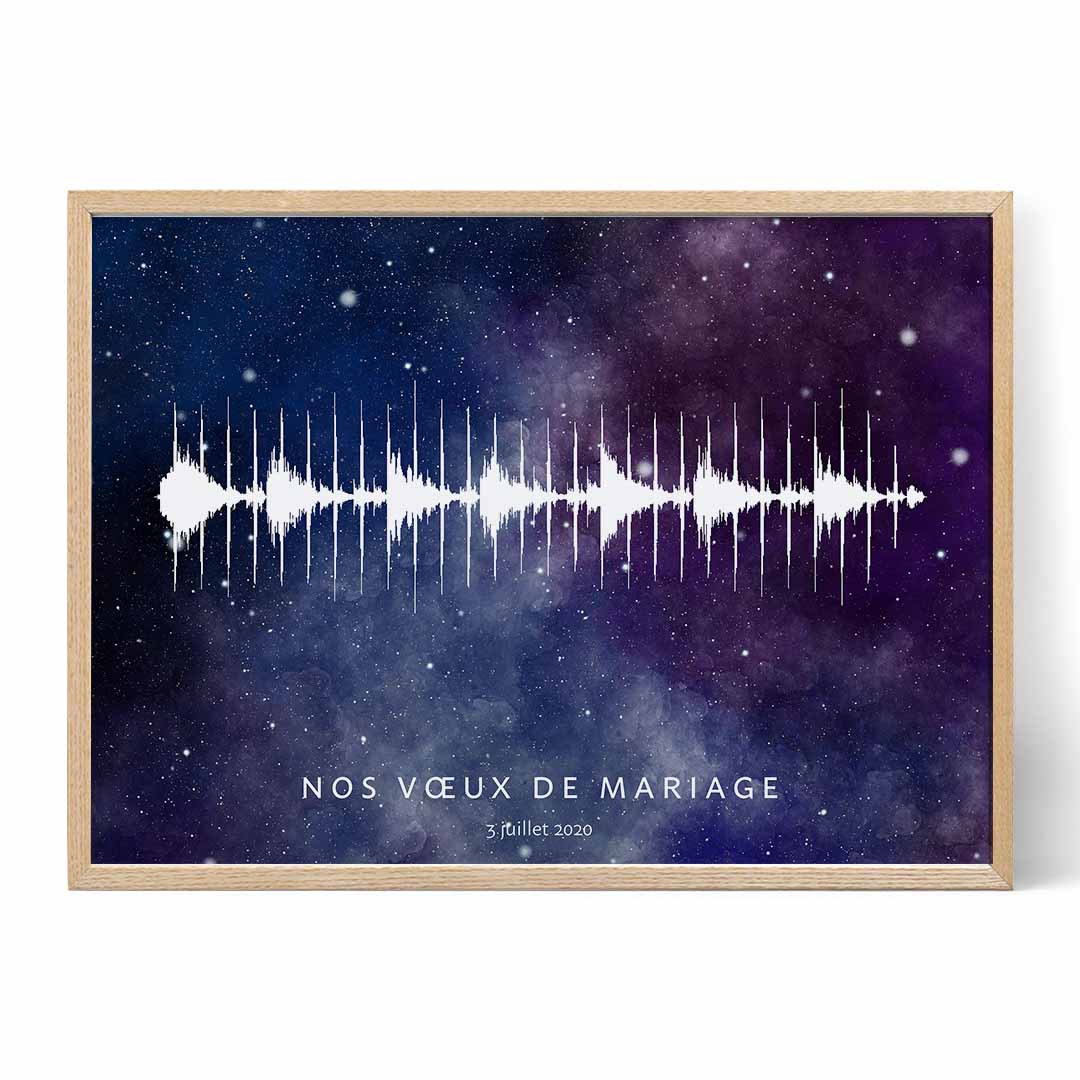 Votre mariage a sans aucun doute été l'un des plus beaux jours de votre vie. Maintenant, vous pouvez conserver à jamais l'un des moments les plus importants de cette journée — vos vœux de mariage. Notre art d'onde sonore personnalisé transforme votre fichier audio en une magnifique onde sonore visuelle. De plus, nous créons nos ondes sonores de manière si détaillée que vous pouvez les écouter en temps réel. Gardez vos vœux présents à l'esprit tout au long de votre mariage en les affichant dans la maison que vous partagez d'une des manières les plus uniques possibles.