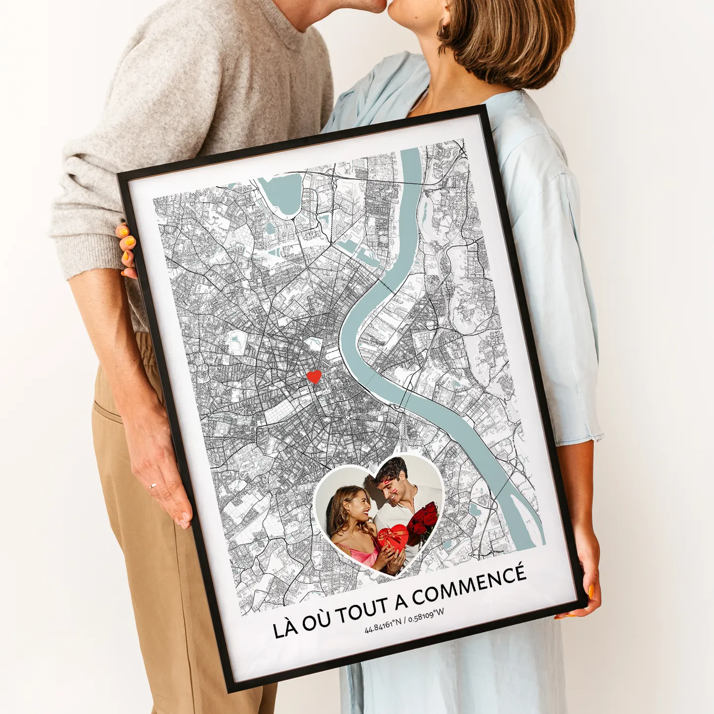 Célébrez l'endroit où votre histoire d'amour a commencé avec notre Carte Là où Tout a Commencé avec Phot. Cette impression personnalisée capture l'emplacement exact où votre voyage a commencé, avec une carte détaillée, un marqueur en forme de cœur pour repérer l'endroit, votre photo et un message personnalisé sous la carte et la photo.