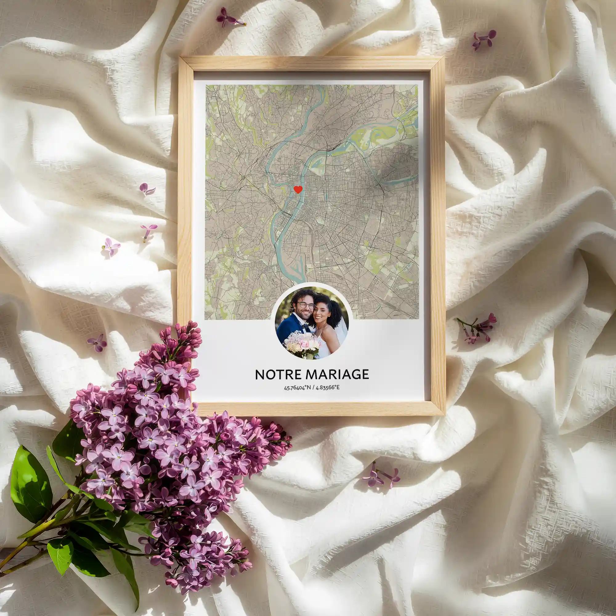 Commémorez l'endroit où a eu lieu le mariage avec notre Carte de Mariage avec Photo. Cette impression personnalisée présente une carte détaillée mettant en évidence l'emplacement exact, un marqueur en forme de cœur pour indiquer l'endroit, une photo du couple et un message personnalisé sous la carte et la photo.