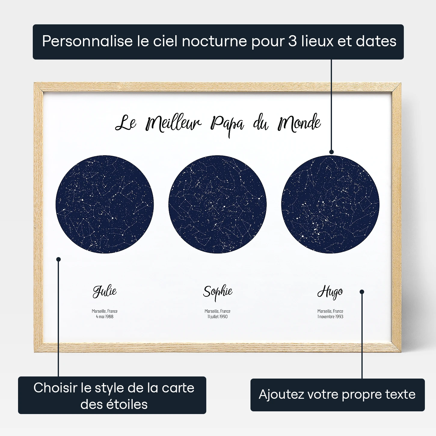 La Carte des Étoiles Triple pour Papa est le cadeau personnalisé ultime pour tout père de trois enfants lors d'occasions spéciales ! Qu'il s'agisse de la Fête des pères, de son anniversaire ou de Noël, cette impression unique ne manquera pas de laisser une impression durable.