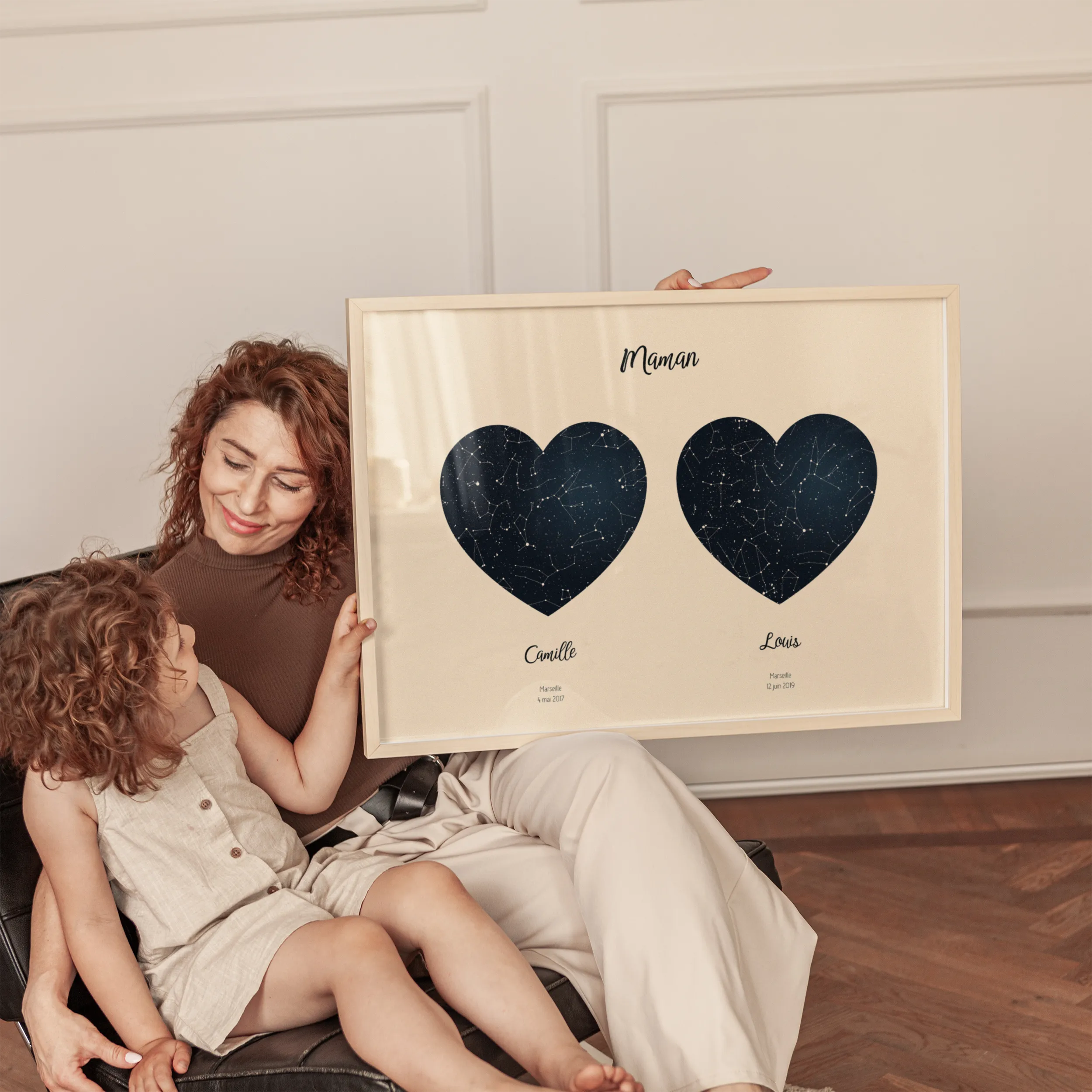 L'imprimé est livré avec la possibilité d'inclure le nom et l'heure de naissance de chaque enfant, ce qui en fait une pièce vraiment unique en son genre. Que ce soit pour la fête des mères, un anniversaire, ou tout simplement parce que, la Carte Double Étoile pour Maman est un cadeau inoubliable qui sera chéri pour les années à venir.